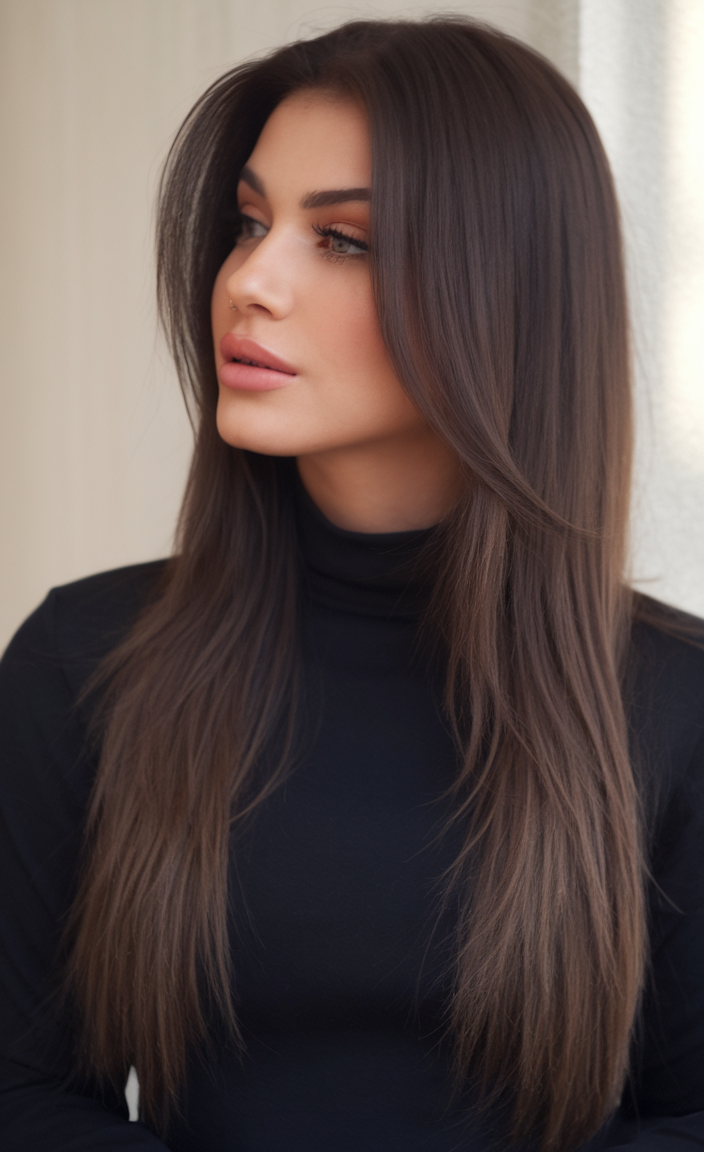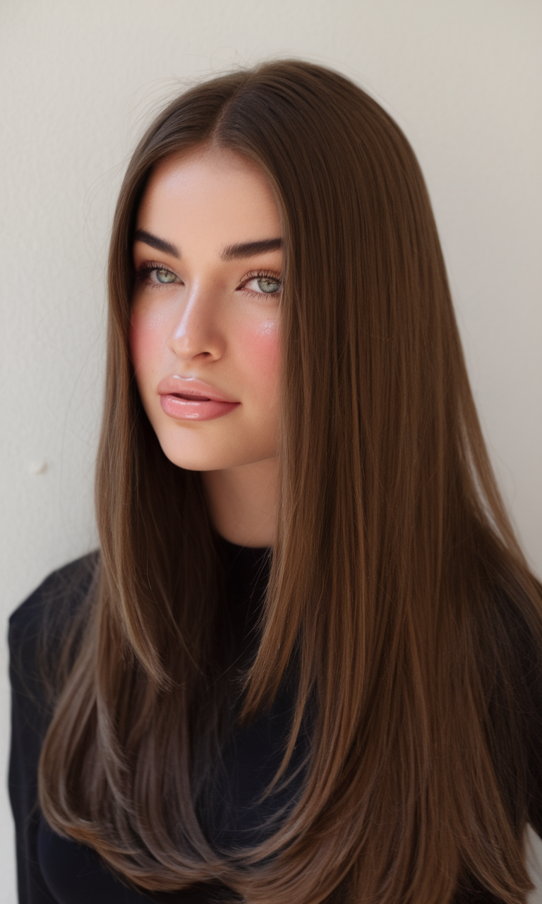 This sleek long hair style showcases rich chestnut tones with soft, flowing layers that enhance natural movement. Perfect for straight hair, the minimalist middle part keeps the look timeless and polished. This style is ideal for women with long thin hair.