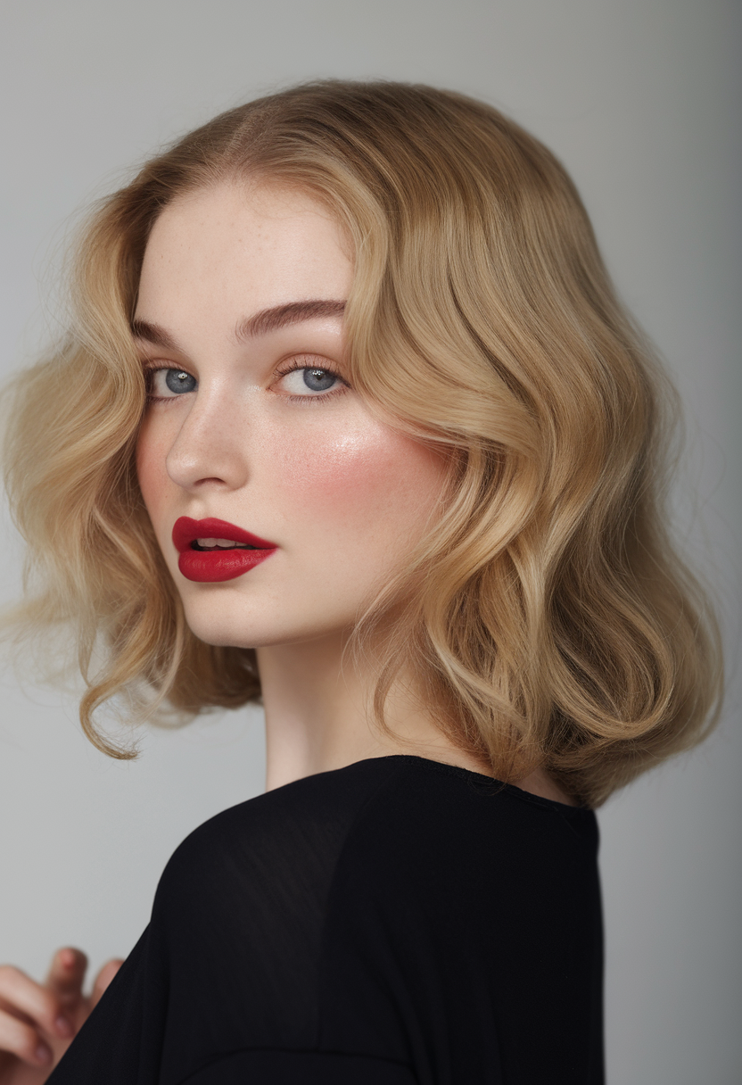 Perfect for teens and women alike, this short, vintage-inspired haircut exudes timeless charm. The glossy blonde color complements the soft waves, creating a polished yet relaxed look.