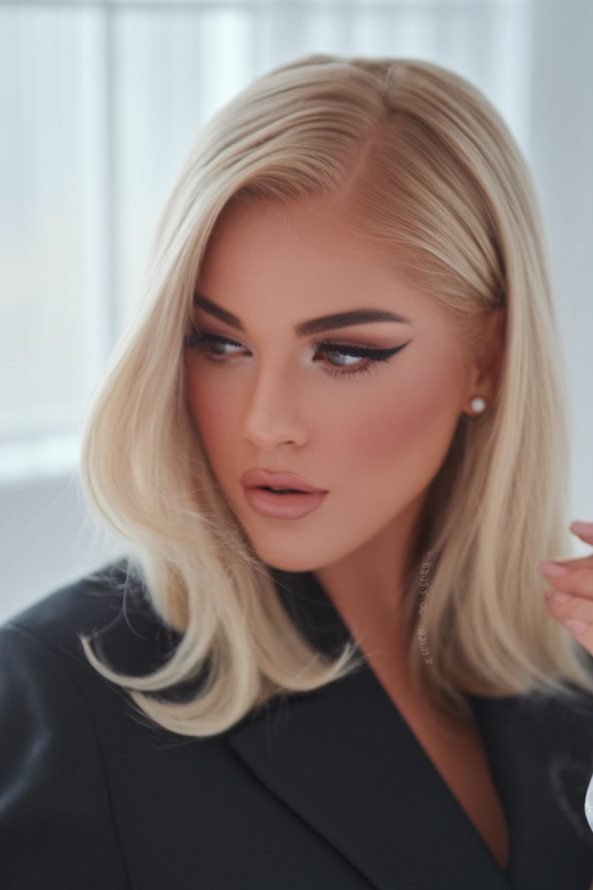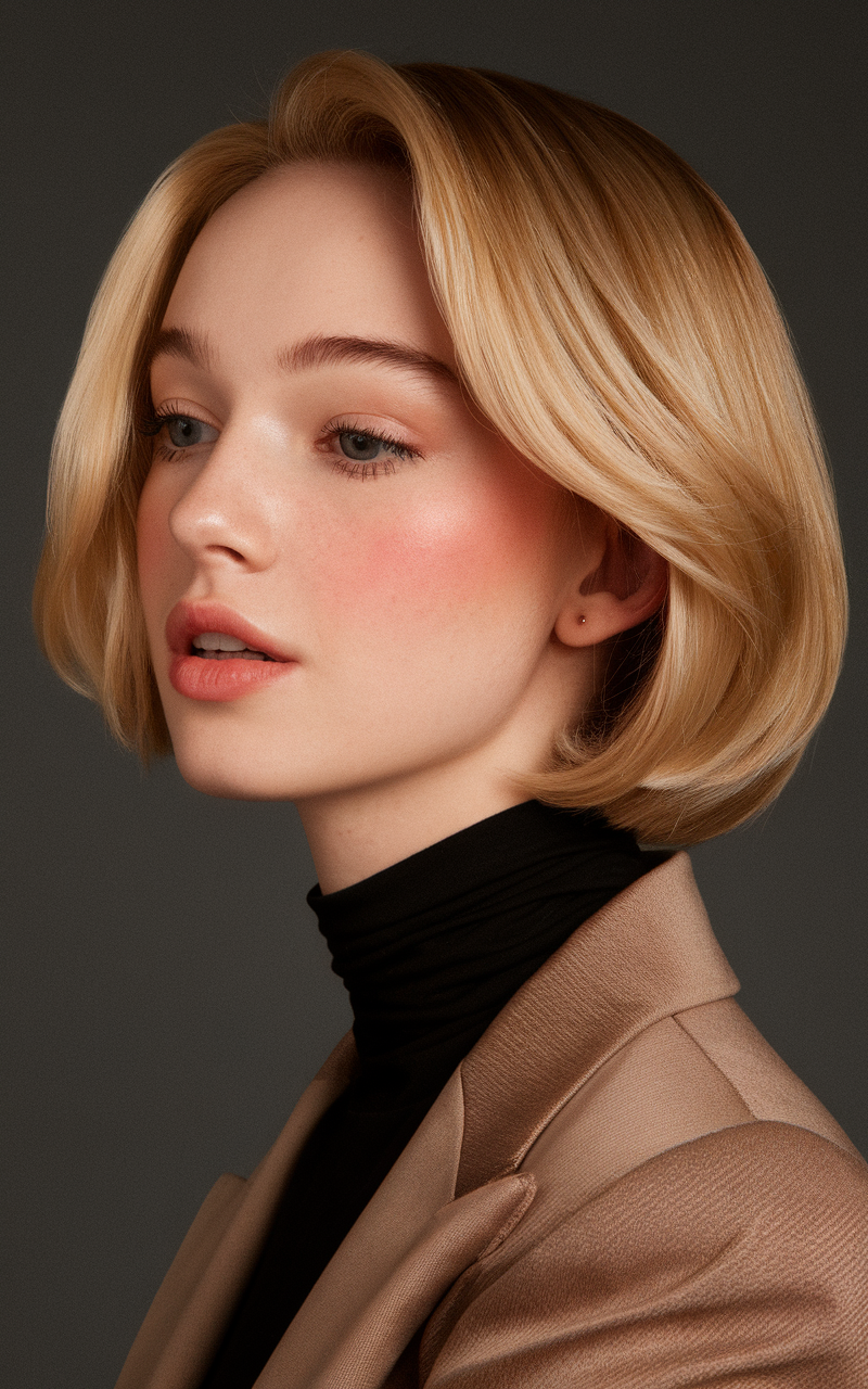 This classic bob features a stunning golden blonde shade that shines with dimension. The cut is impeccably tailored, with soft layers framing the face for a polished and timeless look. The length sits just below the chin, creating a graceful balance between chic and practical.
