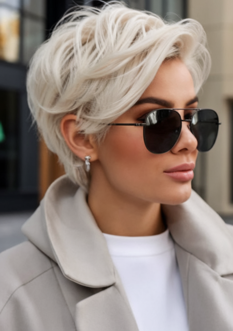 This textured short hair platinum pixie cut is ideal for women who embrace a bold and modern style. The tousled layers create volume and movement, making it perfect for thick hair. Its effortless sophistication pairs beautifully with casual or professional spring outfits.