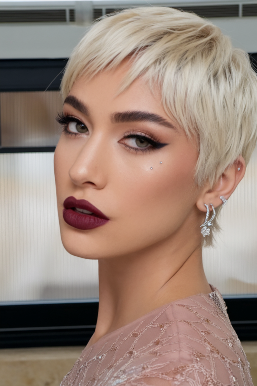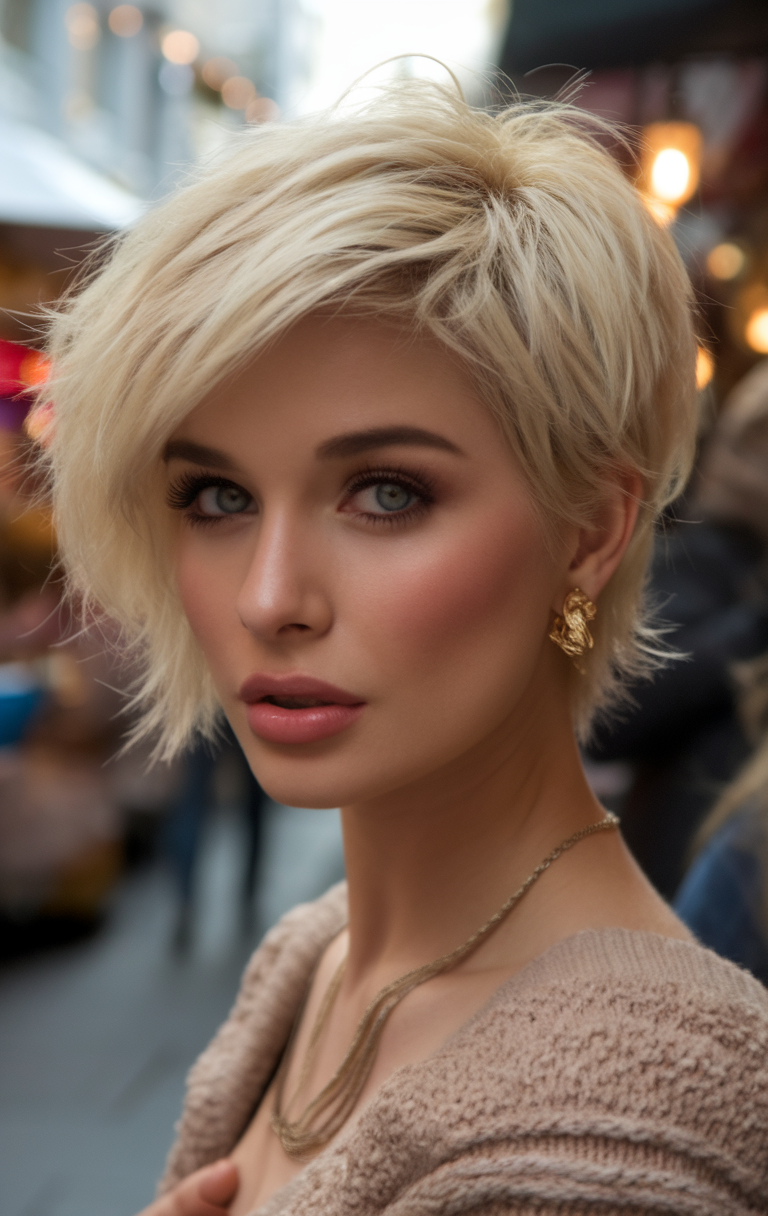 This modern pixie cut showcases a blend of platinum blonde and soft layering for a playful yet edgy vibe. The tousled texture enhances its effortless charm, and the choppy ends add an element of uniqueness. Perfect for anyone seeking a bold, low-maintenance haircut.