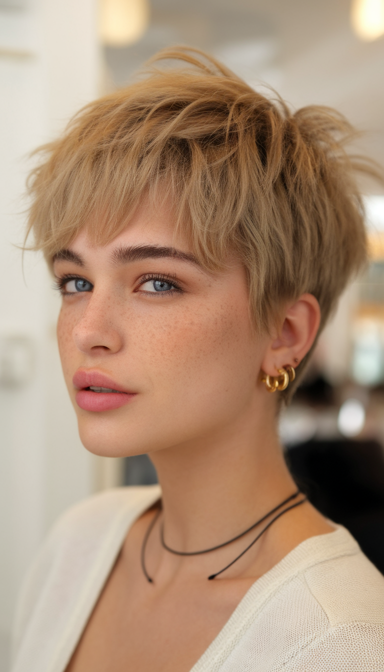 This playful short hair look showcases a messy pixie cut in a warm honey blonde tone. The choppy texture adds character and is perfect for round faces. Ideal for those who love an effortlessly chic style, this haircut is a trendy spring choice for teens or young women.