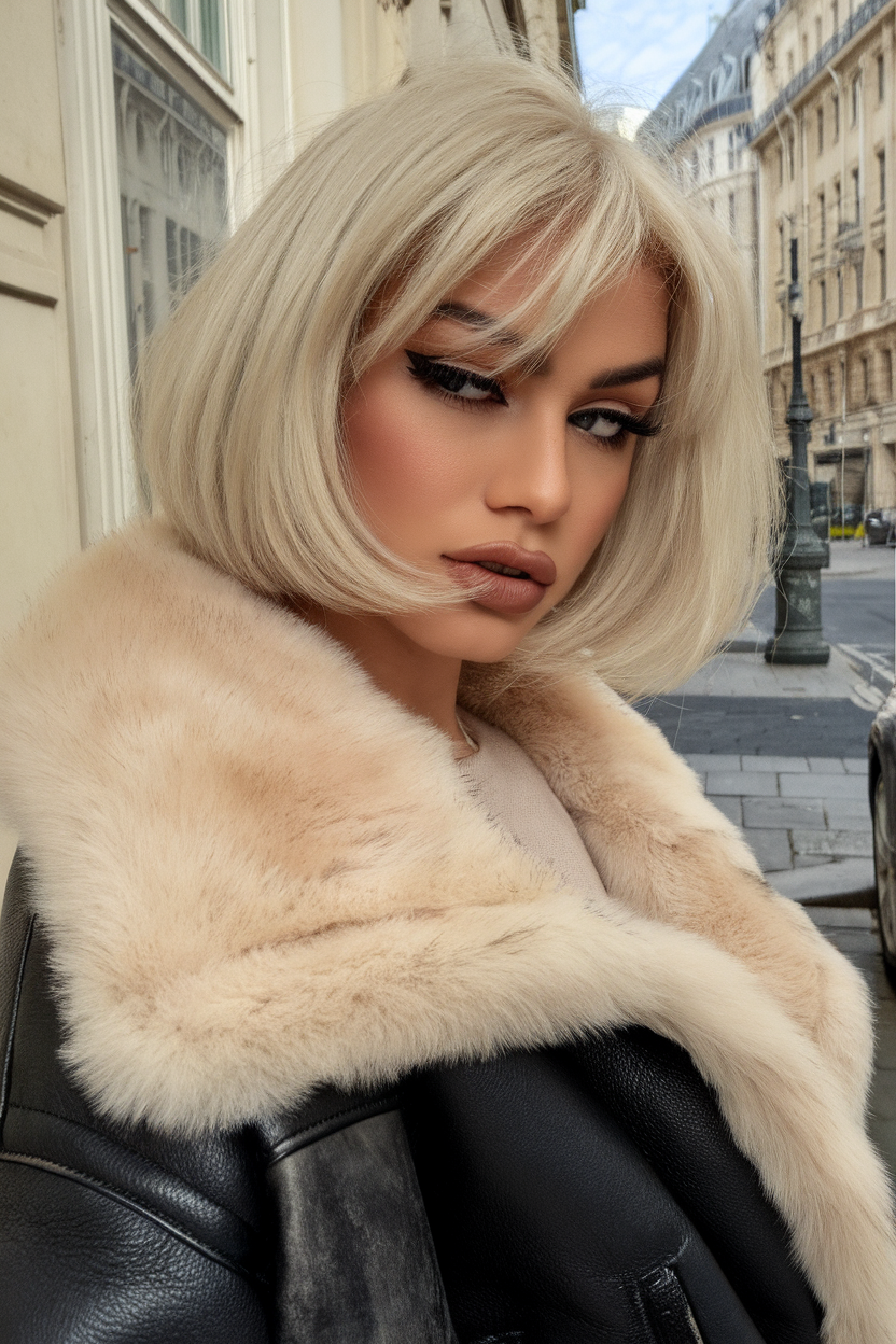 This short hair bob features a sleek platinum blonde finish with soft fringe for added elegance. The clean, rounded edges create a sophisticated silhouette, ideal for women who love timeless styles. Its polished texture makes it perfect for formal events or chic spring outings.