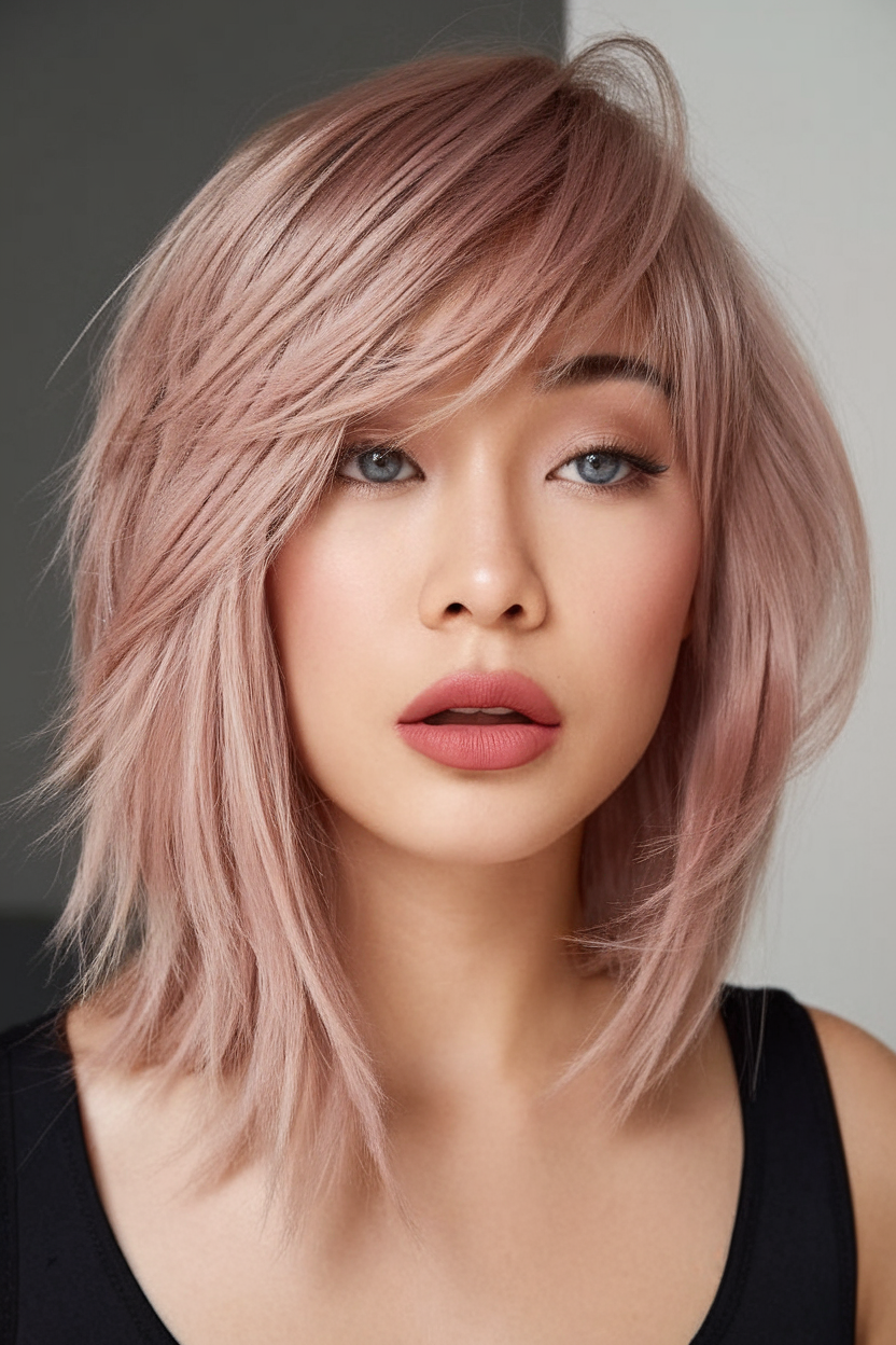 This medium layered hairstyle combines soft layers with a rosy pink hue for a fresh, youthful look. The choppy edges and side-swept bangs add movement, making it ideal for teens or women with wavy hair. The pastel shade enhances the playful vibe, perfect for spring adventures.