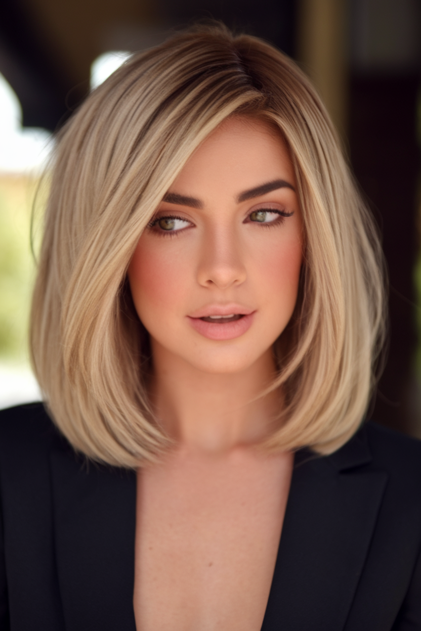 A shoulder-length lob with honey blonde highlights adds warmth and movement to this sleek style. The soft layers around the front create a flattering contour while giving the hairstyle a subtle, natural texture. This versatile lob is perfect for adding volume without losing sophistication.