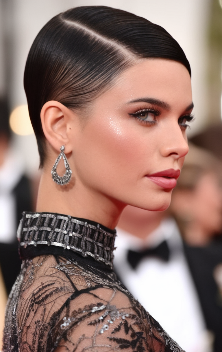 This glossy black updo exudes elegance with its wet-look finish and sleek, combed-back styling. The precise side part creates symmetry, while the polished texture enhances the shine and sophistication. Ideal for formal occasions or a glamorous red-carpet look.