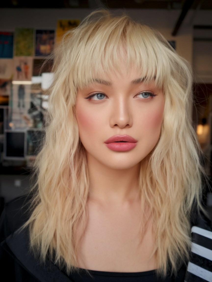 This medium-length shag haircut combines wavy hair with soft layers for a modern, youthful look. The baby bangs create a playful yet edgy finish, ideal for spring statements.