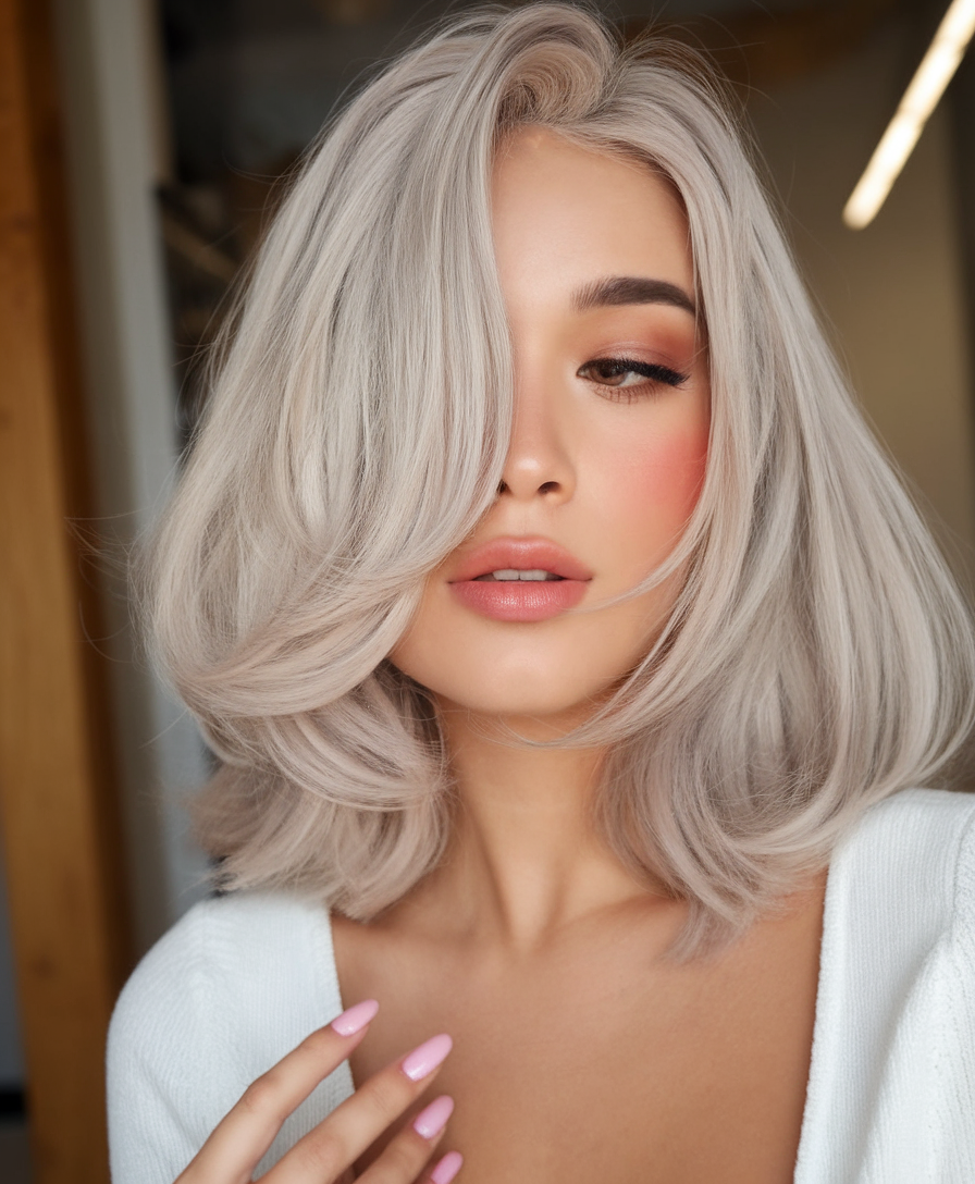 A medium-length hairstyle that screams sophistication, this sleek silver lob features soft layers and a deep side part. Perfect for women with straight hair or thick hair, this style provides an elegant, polished appearance.