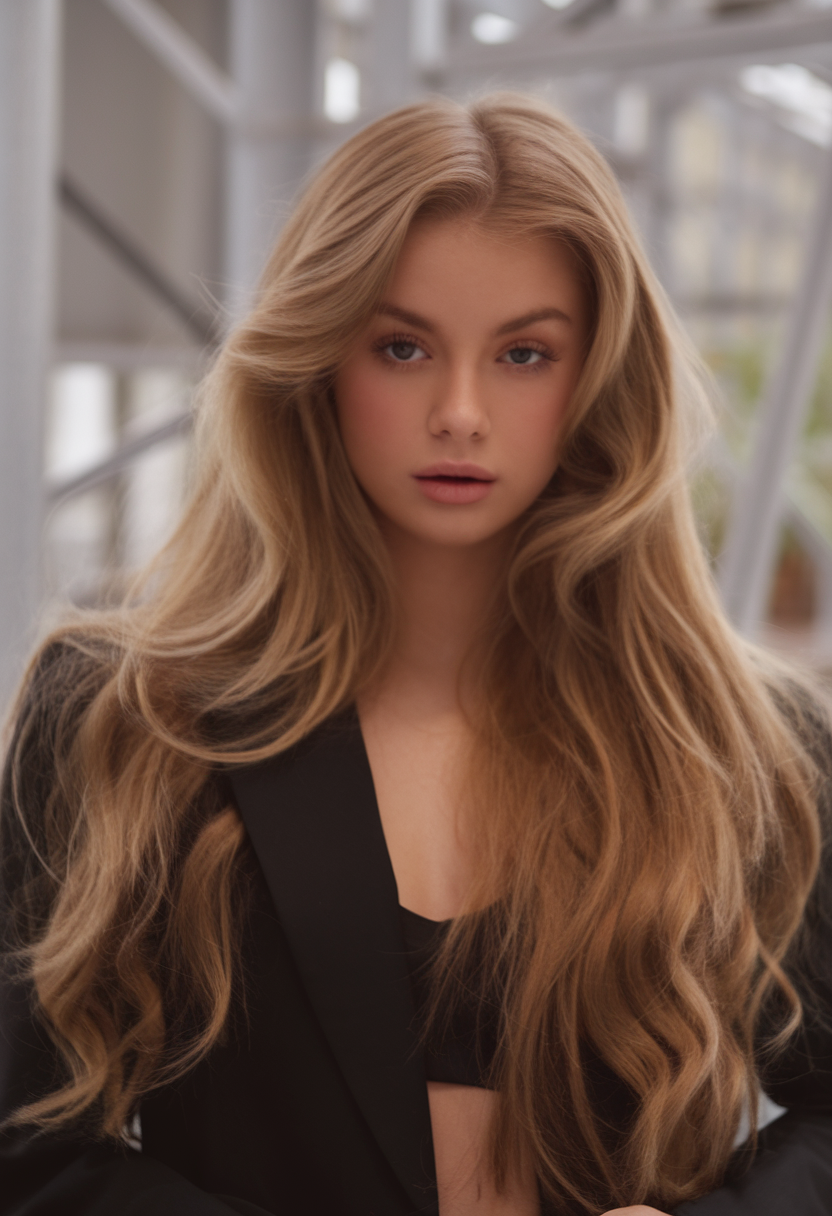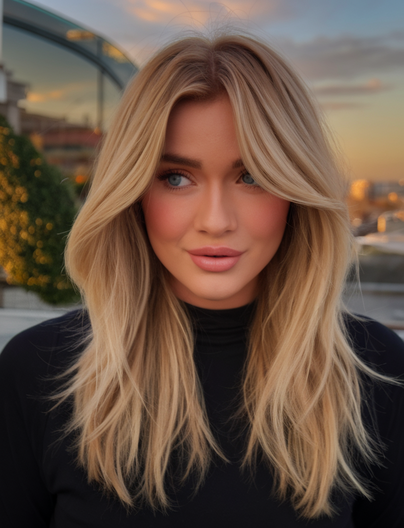 This gorgeous long hair look features cascading honey waves and subtle layers for added volume and movement. Ideal for round faces, the loose waves create a flattering silhouette that enhances natural beauty.