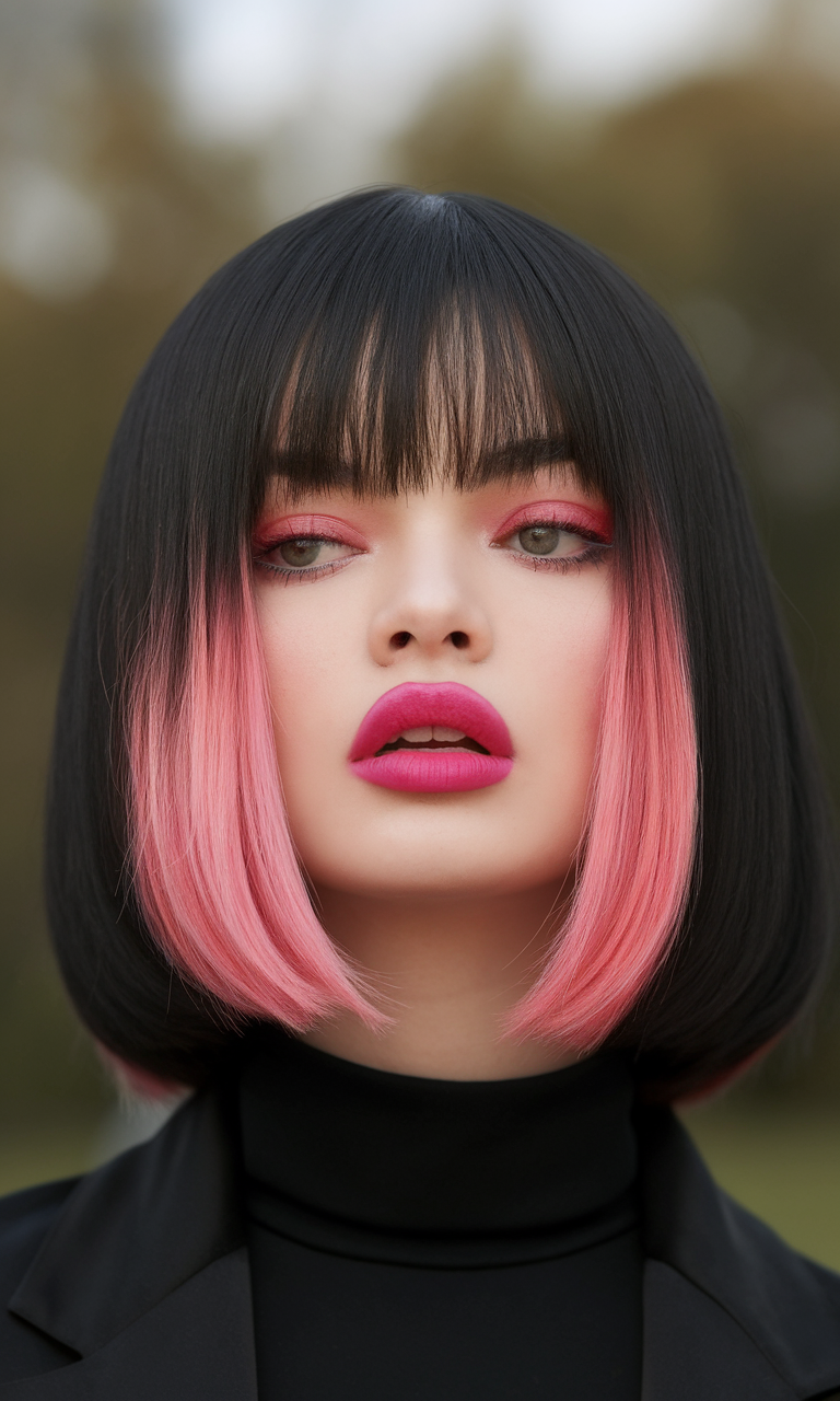 This sleek, edgy bob combines jet-black roots with a vibrant pink ombre for a striking look. The long hair straight bangs enhance the dramatic effect, perfect for teens or women who love to stand out.