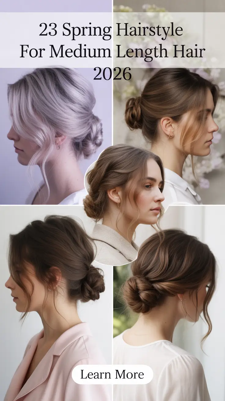 This low bun feels gentle, feminine, and perfectly suited for spring mornings. Medium-length hair is twisted loosely at the back, with soft front strands falling naturally around the face. The subtle highlights create depth and fit beautifully into modern Color trends brunette, making this a refined spring hairstyle for medium length hair 2026 choice.