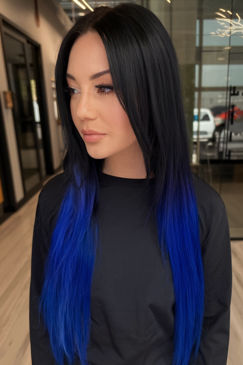 This dark brunette base that transitions into a vivid blue at the ends creates a dramatic winter look. The sleek, straight texture emphasizes the contrast between the dark and bright tones, making it a standout hairstyle. Ideal for those who want a winter look that combines elegance with a touch of vibrant color.
