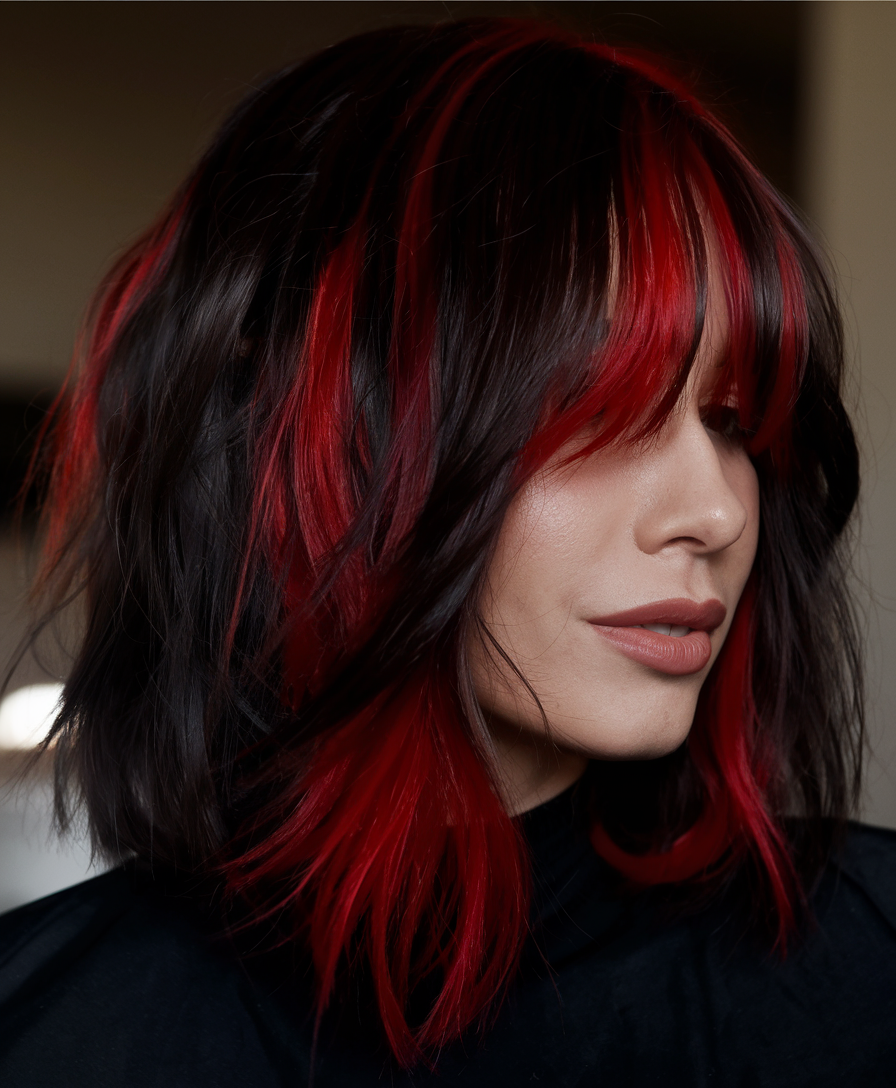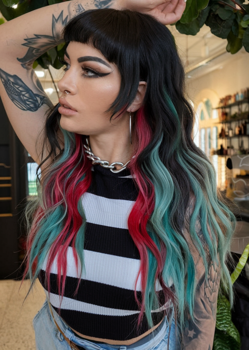 This vibrant and edgy look features a mix of deep black, bold red, and teal hues cascading down from short bangs. The colors create a unique and dynamic palette that makes the look both playful and rebellious. This winter style is perfect for those who love experimenting with bold ideas for brunettes and want to mix bright highlights with a dark base for a truly head-turning style.
