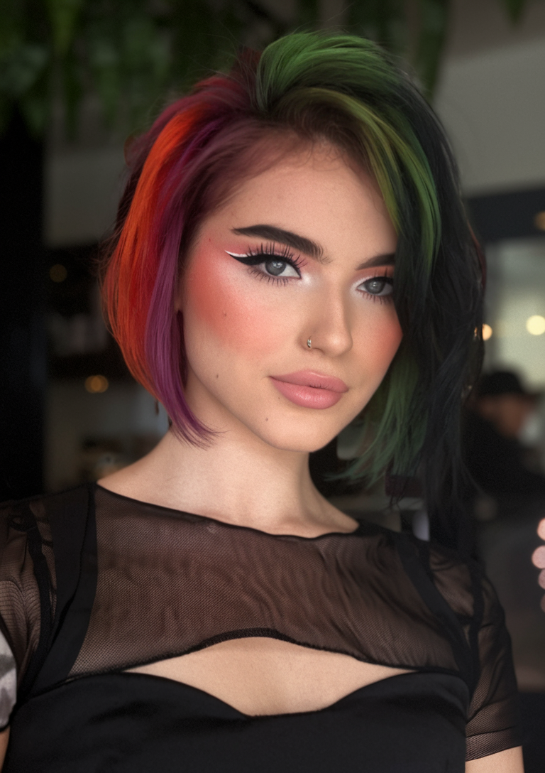 This edgy bob haircut combines a dramatic mix of palette colors, including green, purple, and orange. The sharp, sleek lines of the bob are enhanced by the vibrant highlights, creating a bold contrast with the natural dark base. This look is ideal for anyone wanting an artistic and daring winter style.