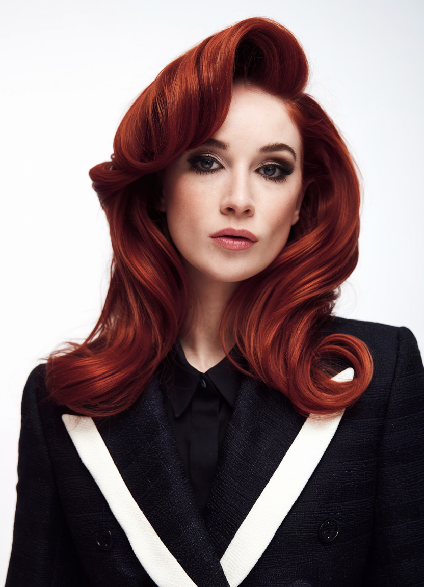 These classic vintage waves, in a rich red hue, offer a timeless yet bold look. The deep curls cascade elegantly, evoking old Hollywood glamour while making a striking statement. This color is perfect for winter, adding warmth and richness to any outfit, making it a great option for ideas for brunettes red.