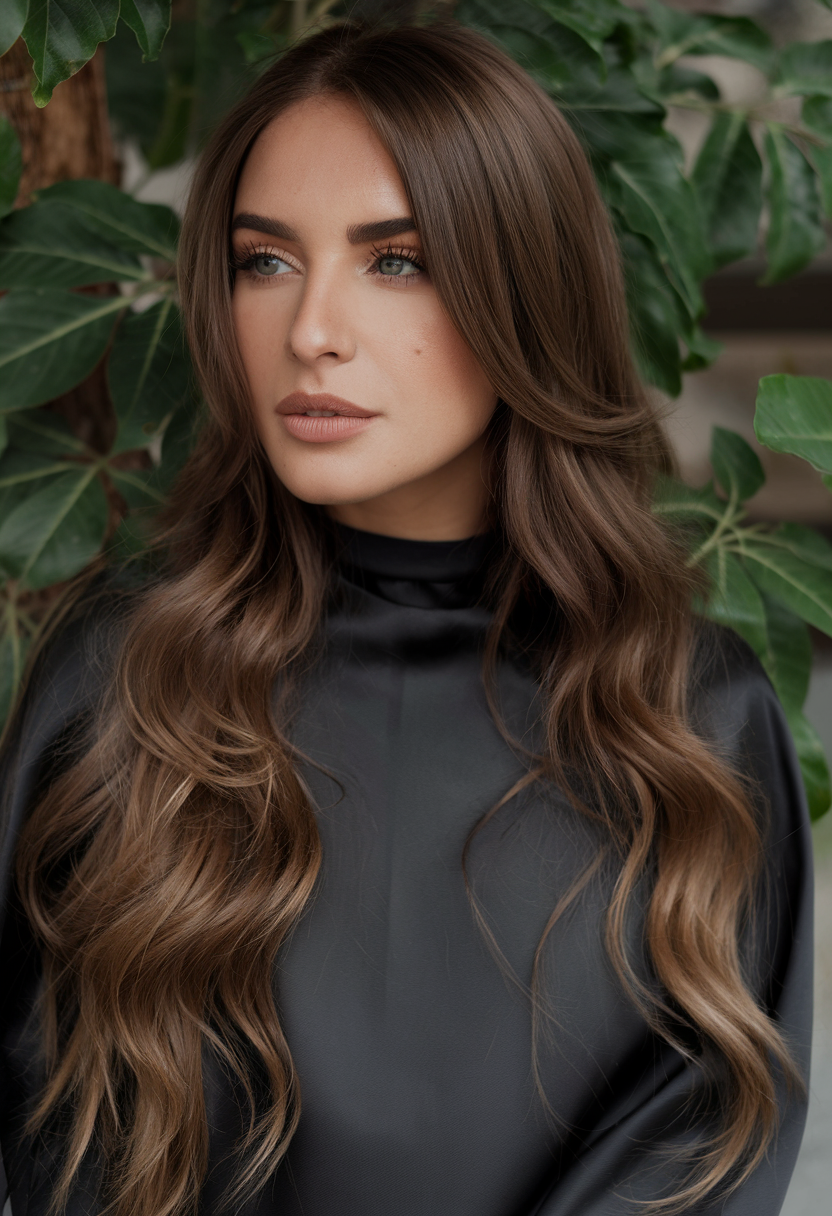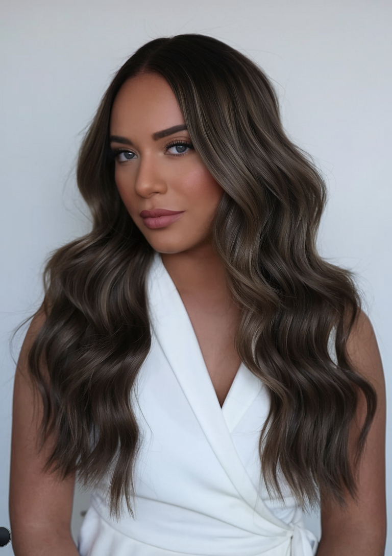 This subtle brunette balayage showcases soft transitions from darker roots to cooler ash-brown ends. The smooth waves add texture, creating a natural yet polished look perfect for the winter season. This style is perfect for those looking for ideas for brunettes balayage that stay natural and elegant.