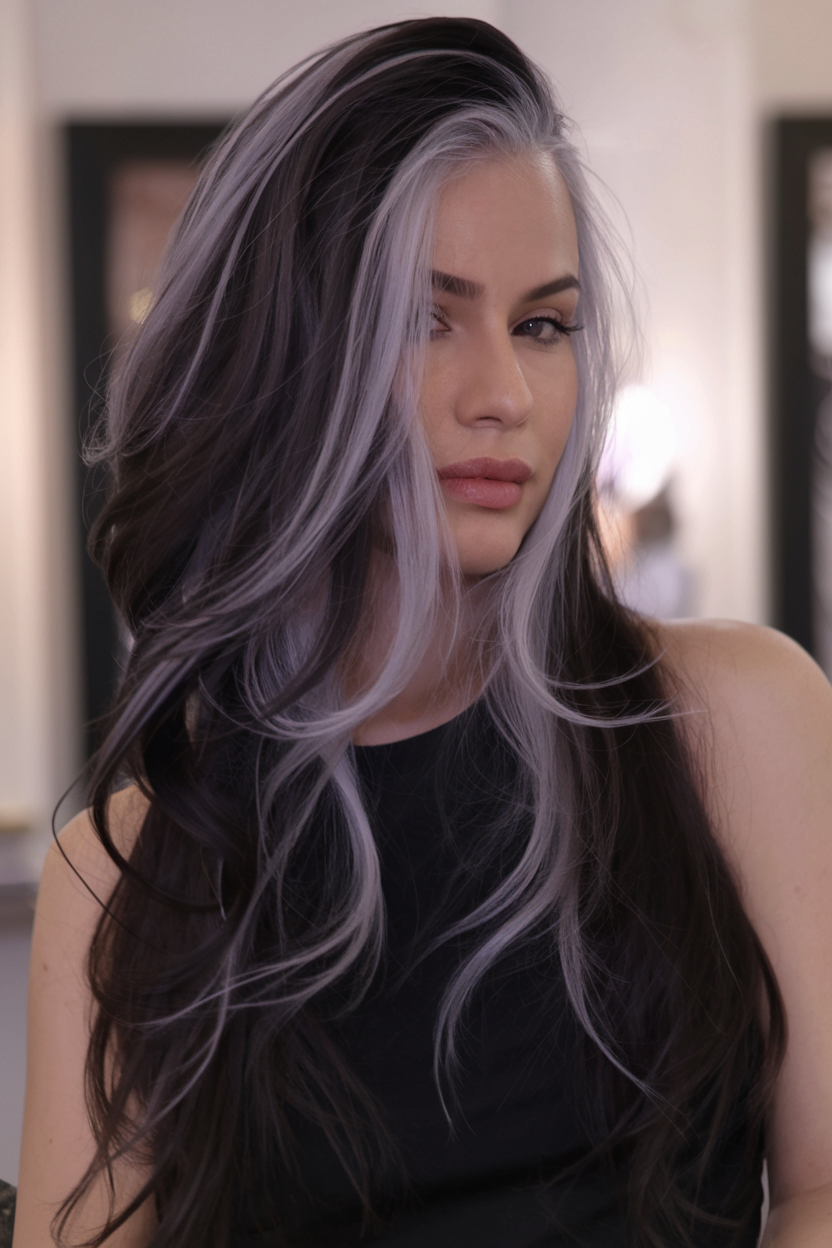 This bold combination of dark brunette hair with icy gray highlights creates an eye-catching contrast. The streaks of gray add depth and texture, giving the hairstyle a wintry, ethereal feel. It’s an excellent option for those looking for ideas with highlights to brighten up dark hair in a subtle yet striking way.