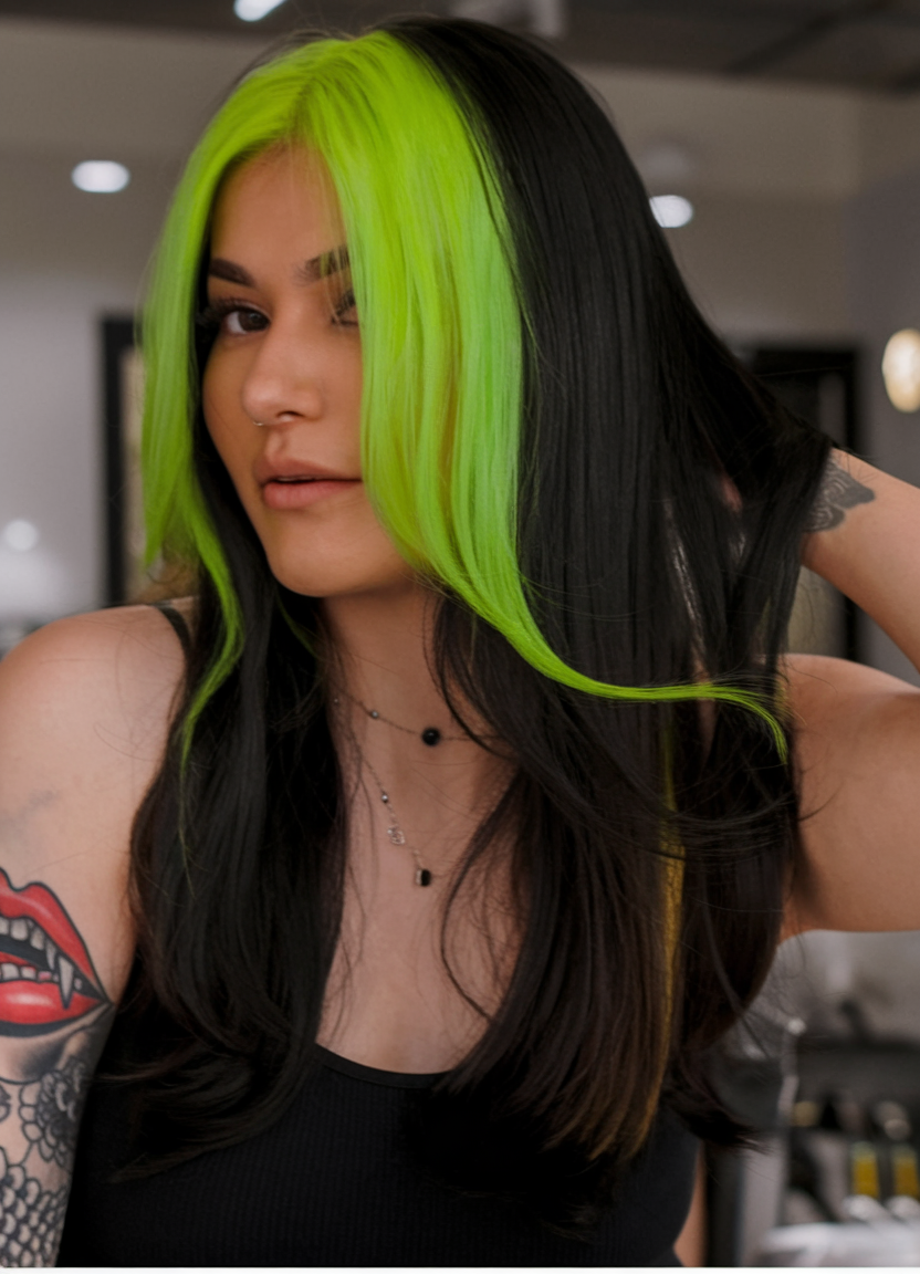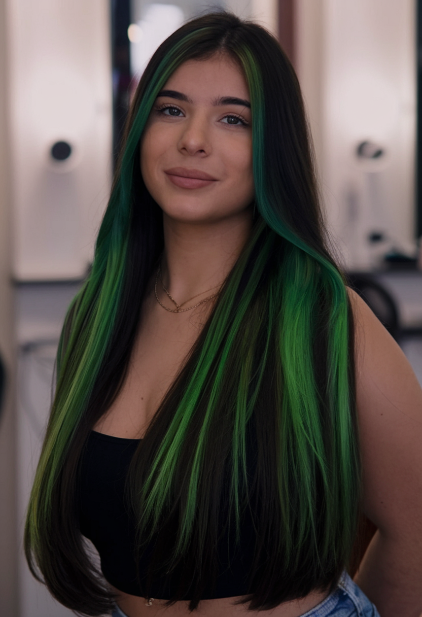 This bold and vibrant hairstyle features sleek black hair accented by neon green highlights. The striking green streaks create a vivid contrast, making the look fresh and edgy. This style is ideal for those looking for bold ideas for brunettes that push the boundaries of winter hair trends.