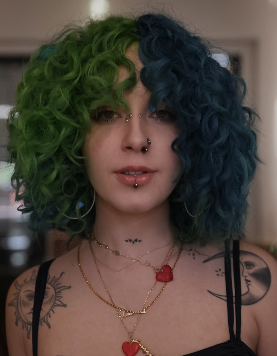 This vibrant hairstyle blends two bold colors—emerald green and deep blue—split evenly across the curly texture, creating an eye-catching and unique look. The natural volume of the curls enhances the contrasting shades, making this style perfect for anyone looking to make a statement.
