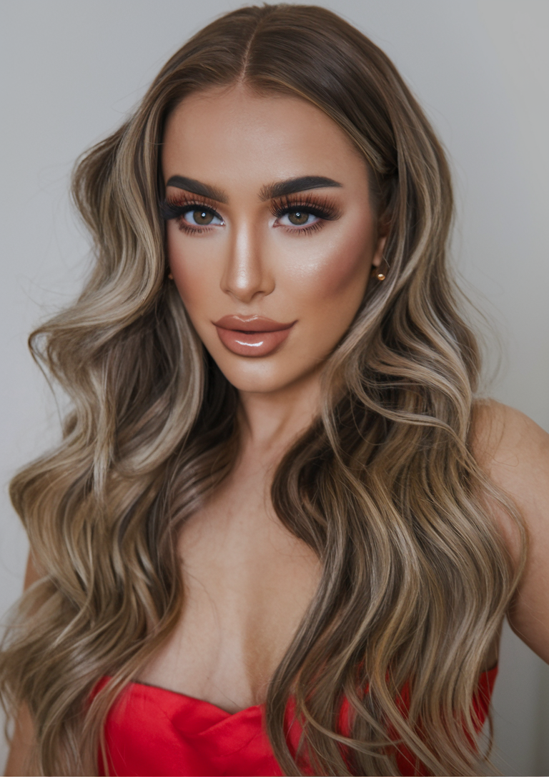 These soft, cascading waves feature a subtle blend of warm brown and honey highlights. The dimension created by the waves and highlights gives this hairstyle a natural yet polished appearance.