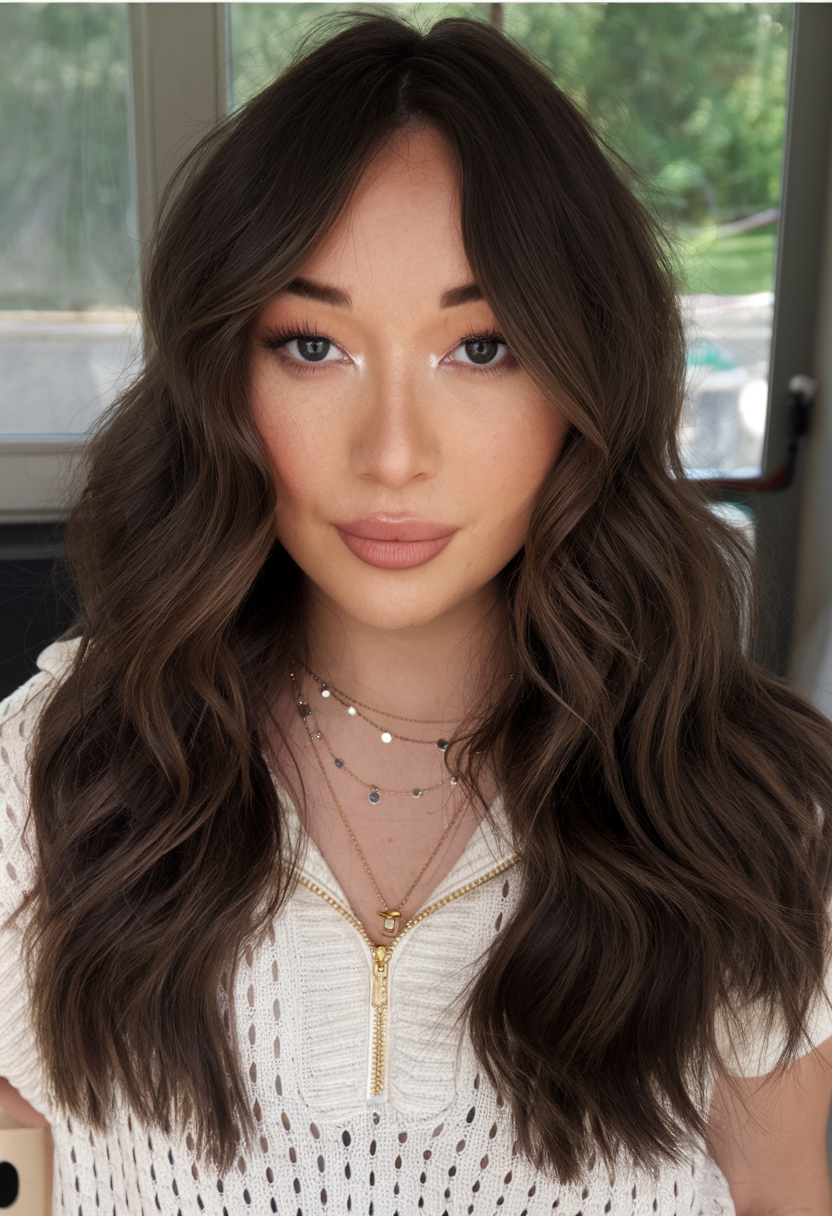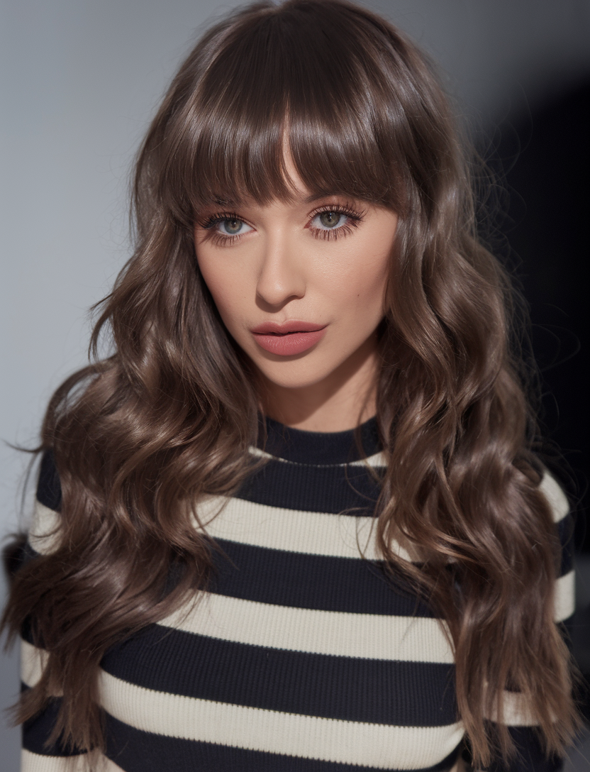 These luxurious waves with blunt bangs frame the face perfectly. The rich, dark brown color adds depth, while the subtle waves give the hair movement and bounce. The bangs give this style a chic, modern touch, making it perfect for a fresh, trendy look.