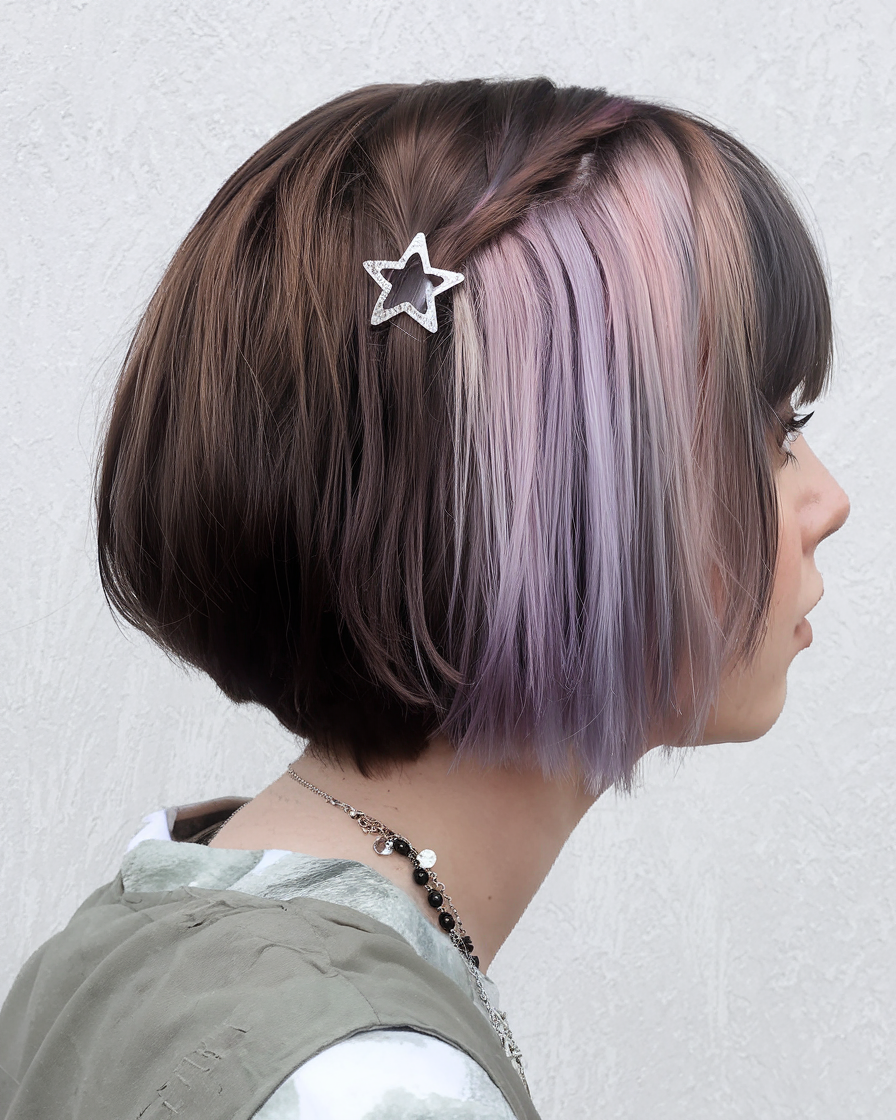 This edgy bob stands out with its combination of dark brown and lilac highlights, perfect for someone who wants to make a bold statement this winter. The soft deep purple hues contrast beautifully with the darker base, offering a modern take on classic short hairstyles.