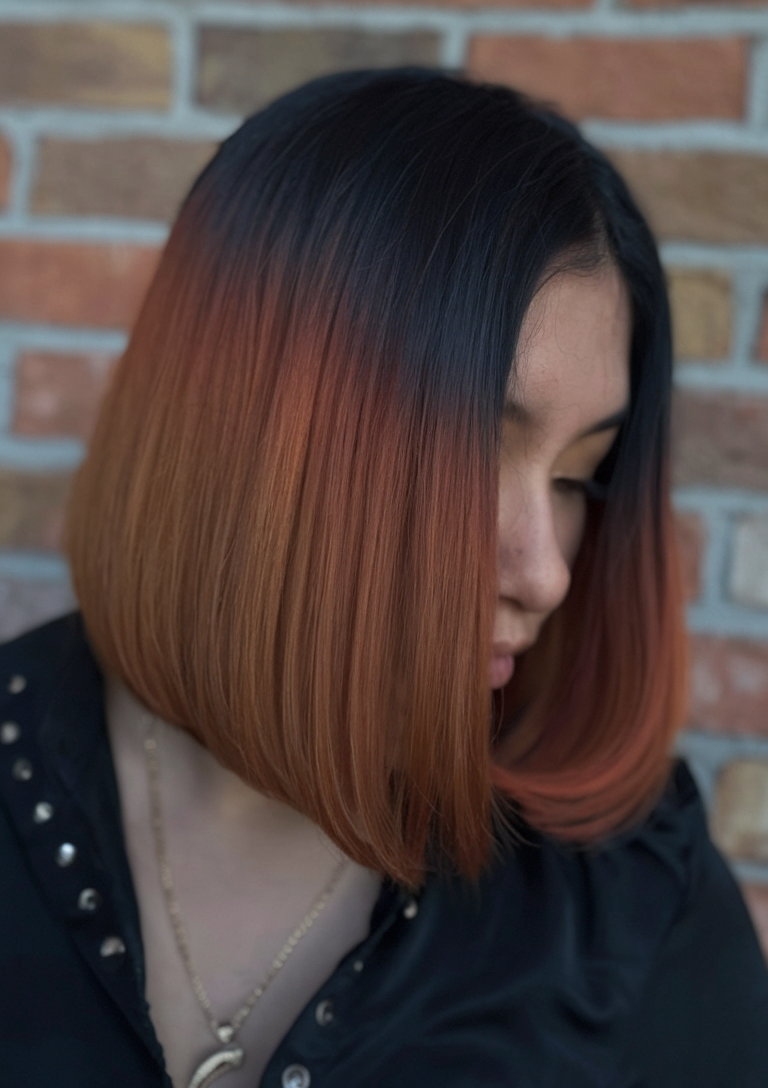 This short bob is transformed with a smooth transition from dark brown roots to burnt orange ends, showcasing a vibrant yet refined balayage. The sharp, blunt cut adds structure, while the orange tones give it a winter-friendly warmth. It’s a great choice for those looking for ideas with highlights and a bit of flair in their shorter hairstyles.