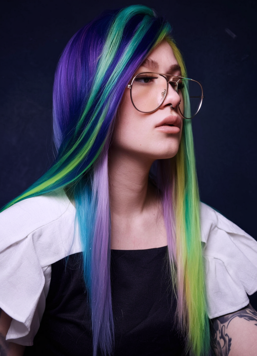 This striking combination of deep purple and neon green delivers a futuristic vibe, with intense streaks that make the look unforgettable. The contrasting colors give it a high-fashion edge, perfect for anyone seeking an unconventional winter hairstyle. The sleek, straight texture ensures the colors remain the main focus, showing off the bold palette.