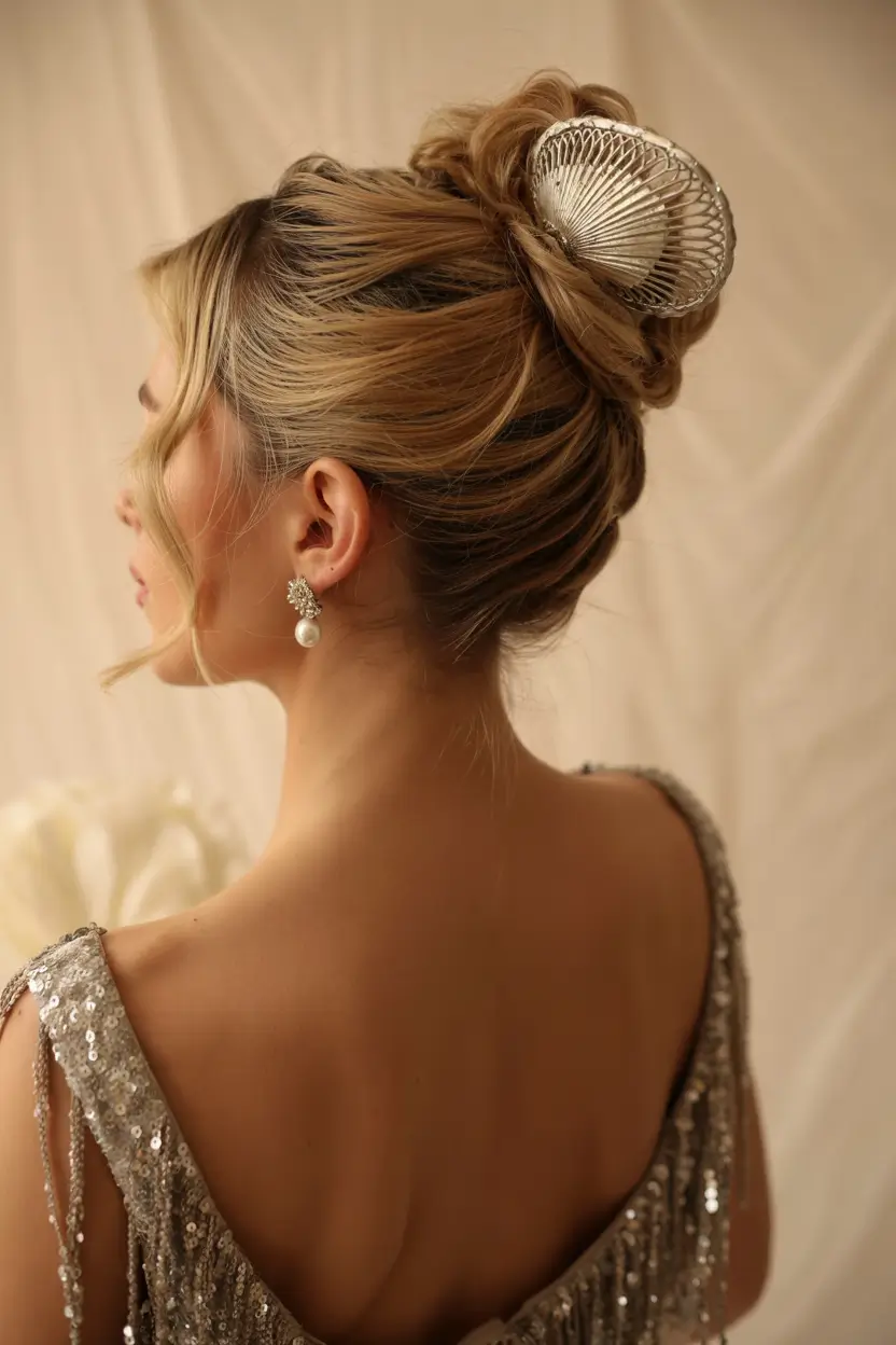Buns have always been my favorite because they achieve an elegant regal appearance effortlessly. This one nails it. The bun’s soft twisting creates a voluminous top style that maintains structure while providing summer night breathability. That shell-inspired silver accessory? The accessory transforms this hairstyle into something grand like a crown except it brings coastal vibes. Thick hair types can use this style because it maintains shape and avoids flattening the dramatic effect. Elegant, but with edge. Wedding guest look? Nailed it.