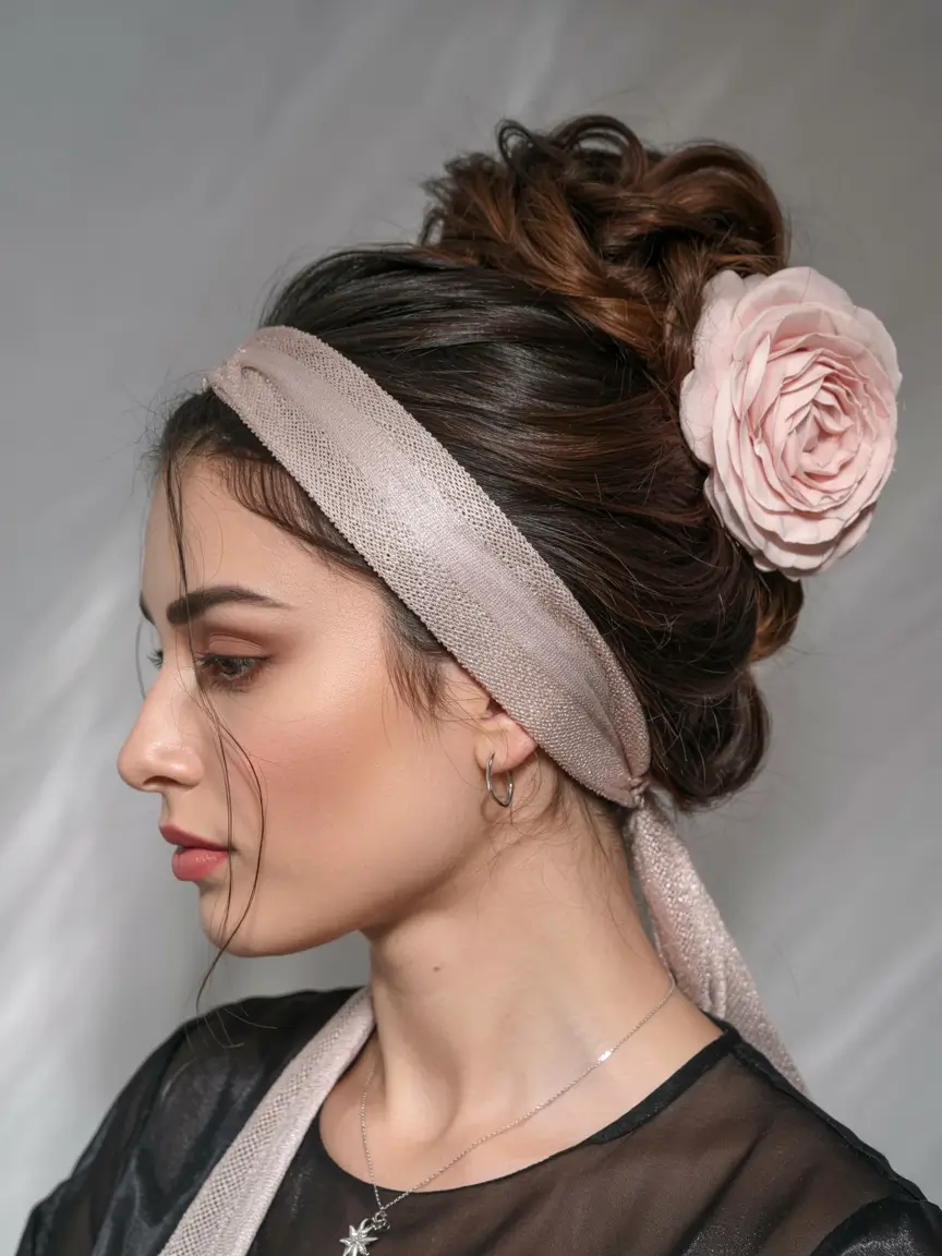 To wrap things up we created a vintage-inspired boho bun design that looks fantastic on social media. The bun’s top is held together with a sheer pink scarf that becomes both a headband and flower holder when knotted behind a fresh silk rose. It brings an old movie star into today’s world with style. This style lets you add style to short hair or layered cuts that do not hold together well in buns. The headband pulls everything together.