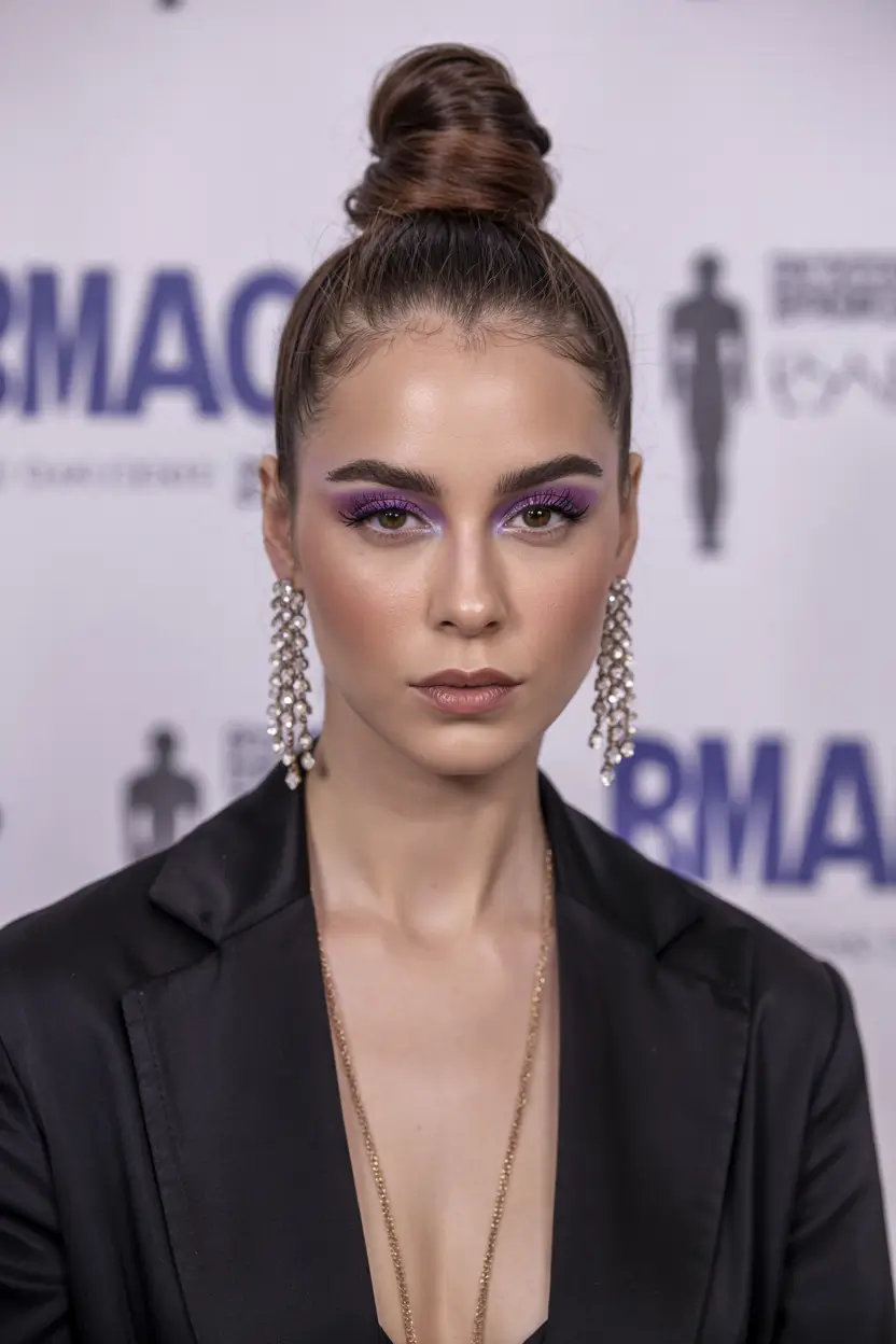 At a spring gala event I styled this bun with a black plunging blazer. When you wear chandelier earrings and create a strong eye look you instantly capture everyone’s attention with your appearance.