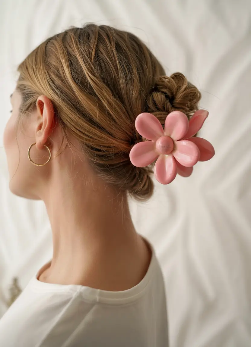 If you lack a flower clip use a silk alternative or colorful claw clip instead. You can create this look easily with a silk flower clip or a pop-colored claw clip.