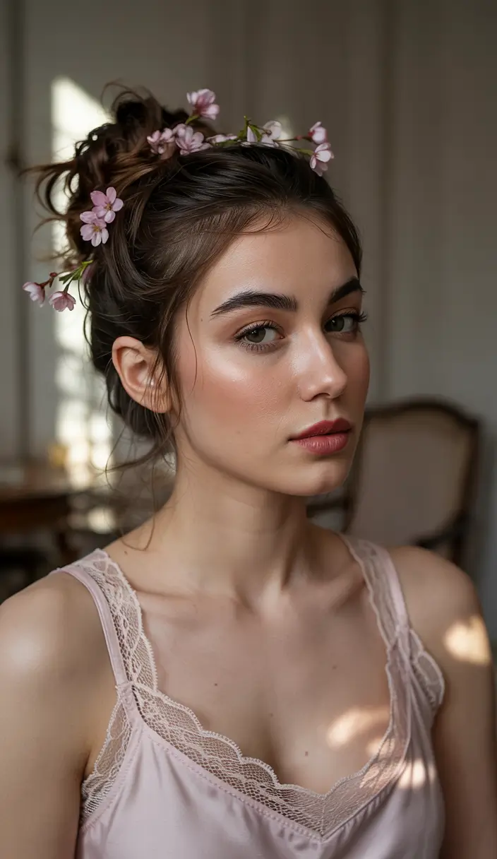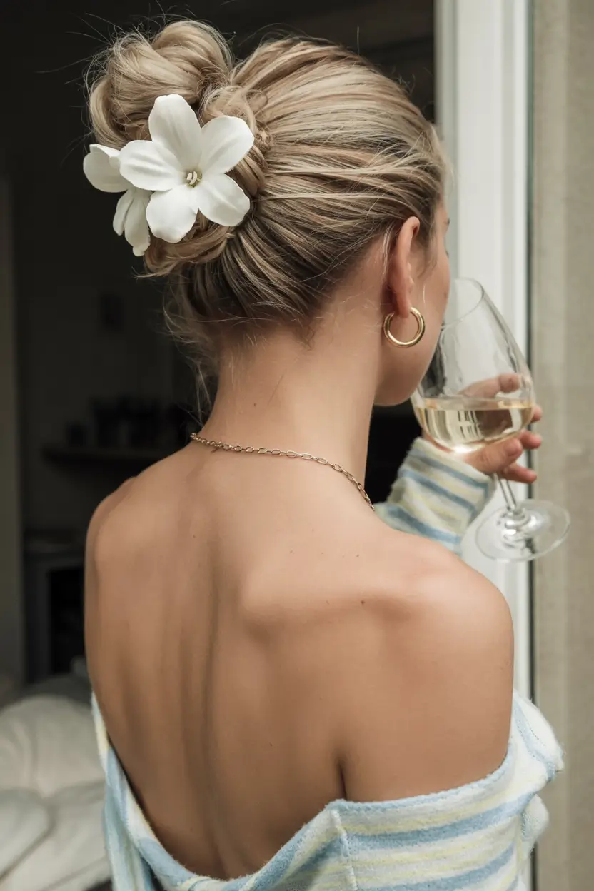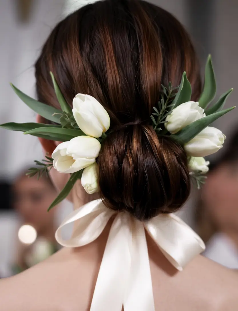 This one is pure romance. A basic low bun receives satin manipulation before receiving tulip and greenery floral accents to produce garden-inspired results. This elegant style works best for special events because it delivers a dreamy soft appearance that matches wedding and summer settings perfectly.