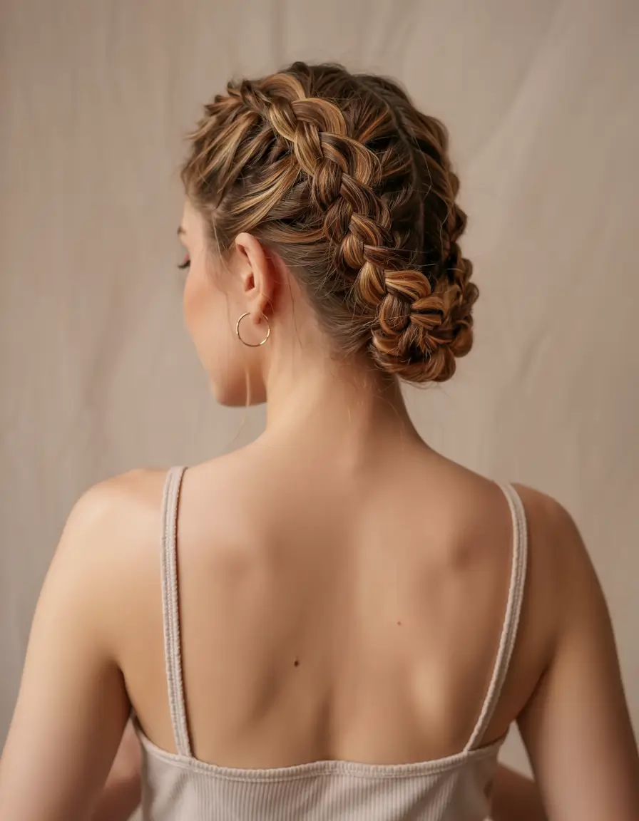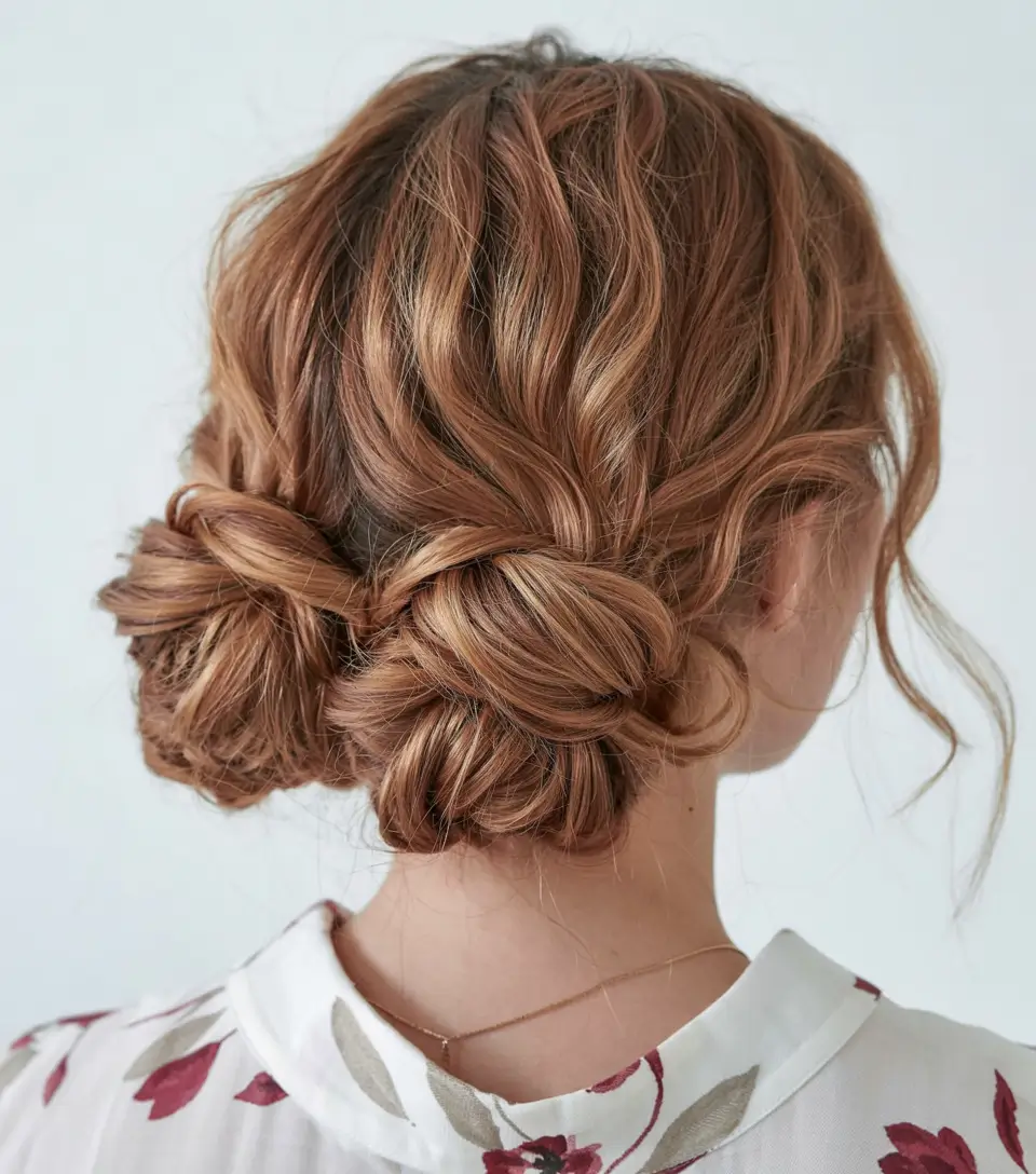 When you make two buns you bring more enjoyment to everyone. Two small braided buns receive rosette-shaped twists near the back of the head. This style combines playful charm with firm construction plus gentle softness. These buns work perfectly for children and festive occasions plus any summer occasion that needs an interesting hairstyle. The braiding technique creates stability and texture making it an excellent choice for medium hair that does not want a full-volume hairstyle.