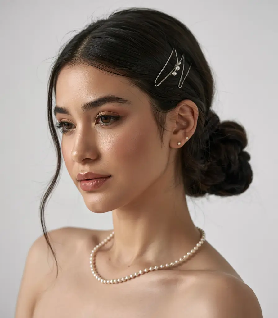 A centered low chignon with its bold pearl barrette creates a timeless elegant look. The style looks elegant yet modern and achieves timeless grace without requiring any filters. You can wear this elegant bun with pearl decorations for weddings or social events plus it looks stunning at home when you go all out. The style looks fantastic on medium hair and matches both thin and thick hair types smoothly.