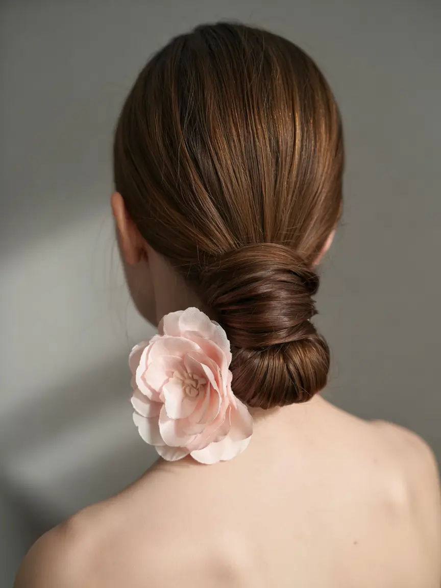 Florals for summer? The new approach to this technique feels revolutionary while remaining gentle. The wrapped chignon design combines vintage and clean styles to form a polished result. An oversized blush flower at the nape of the neck creates the look’s final touch. This style grabs everyone’s attention without making a lot of noise. The style suits both long and medium hair when you smooth and arrange your hair properly. This elegant hairstyle serves weddings and children’s recitals perfectly and creates stunning visual results in camera.