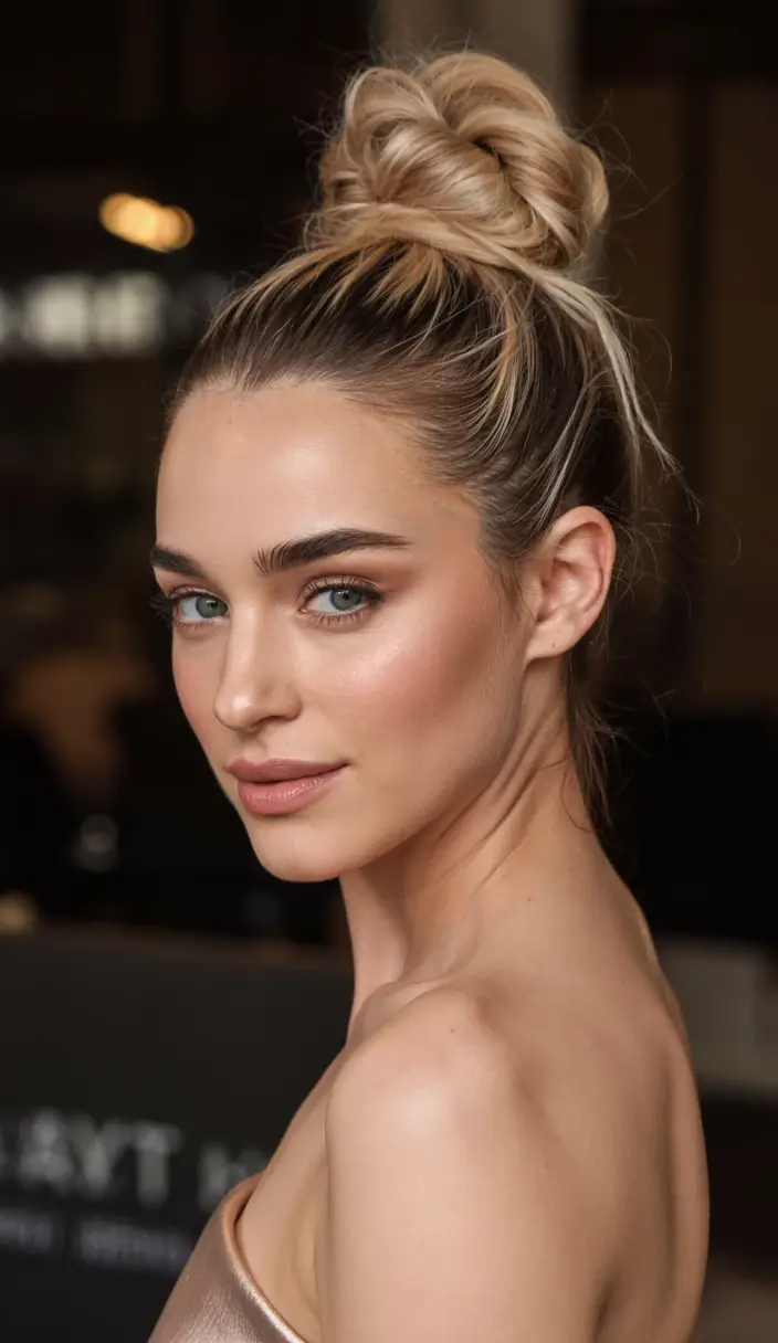This easy-to-create soft top bun works perfectly for romantic occasions and brings effortless elegance to brunch or date events. The style sits at the top of your head and creates volume through soft styling. The lighter hair sections create texture while the root area remains softly brushed back to produce the perfect difference. Long hair looks fantastic with this style especially when combined with luminous makeup and off-the-shoulder satin. This hairstyle works best for both summer weddings and golden hour get-togethers with friends over wine.