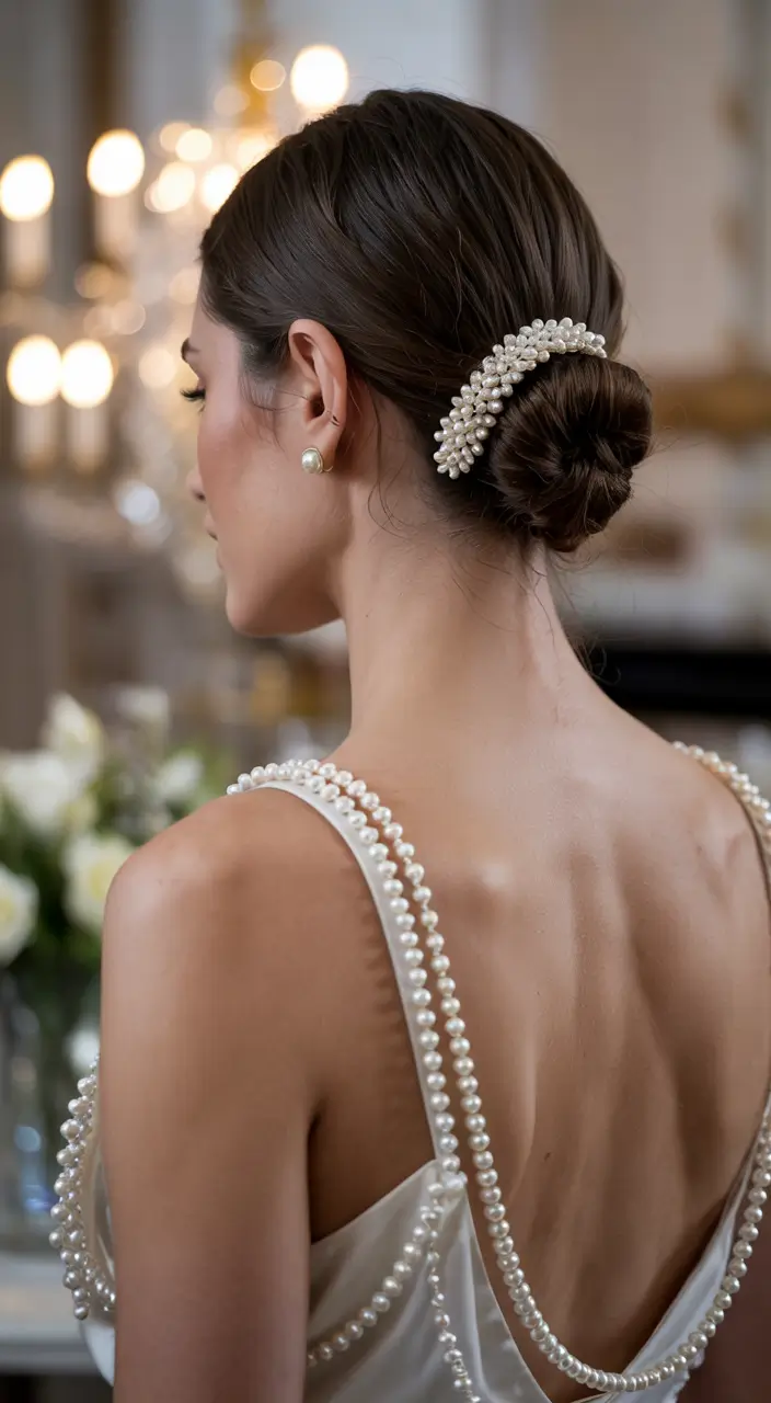 A small amount of golden wire or pearl thread threaded through your bun transforms its appearance for editorial or wedding reception settings.