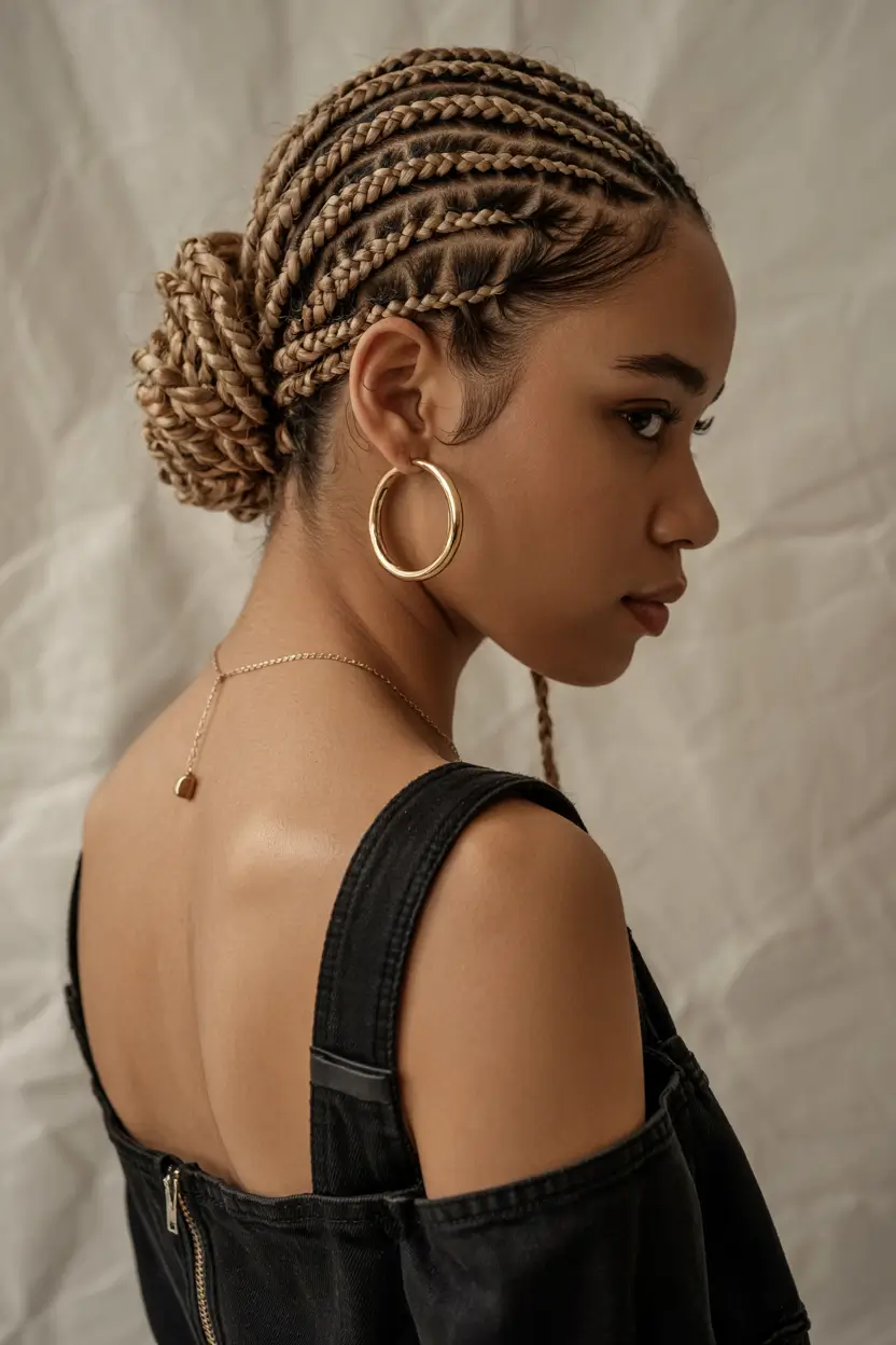Let’s take a minute to appreciate the braided bun style. The braided bun creates more than a simple hairstyle because it delivers an entire unique aesthetic. This summer-ready style combines intricate detail with exceptional functionality. Protective styles such as this one suit both children with curly hair and adults who want style without everyday upkeep. A braided bun creates a soft full bun at the base through defined braids while chunky earrings with strapless looks make this style a perfect chef’s kiss.