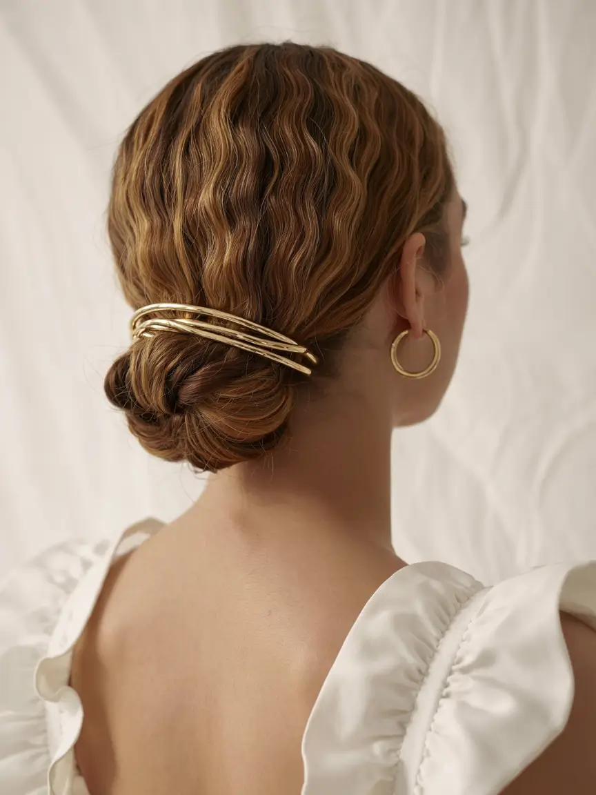 The smooth romantic style of this effortless bun speaks without shouting to create an effortless appearance. The hair receives subtle wave styling before it is crafted into a timeless low bun with that 1920s sculptural elegance and mermaid-inspired movement. Long hair and medium-length hair types will benefit from this elegant style that avoids excessive fuss. That three-strand gold clip detail? Honestly, it’s giving main character.