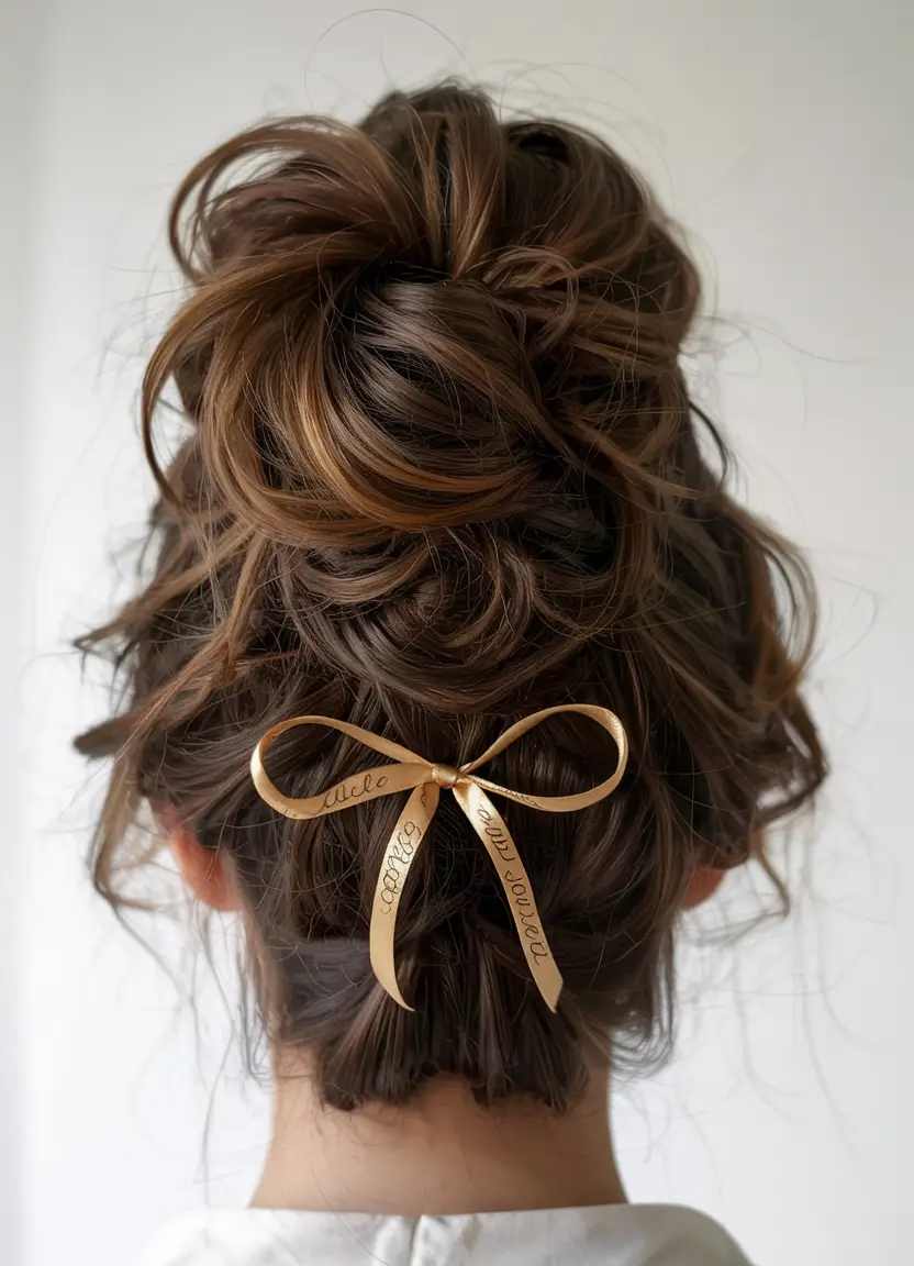 When you only have five minutes and a claw clip and plenty of brunch energy this is the style to choose. But wow—it delivers. A voluminous tousled bun finished with a caramel satin ribbon completes this look on loose curled hair. Make this style playful while maintaining an adult look. You can achieve a composed appearance while running quick tasks or attending school by using this simple style. The layers create movement while providing softness which works for any hair length and density—simply apply volumizing powder to the roots.