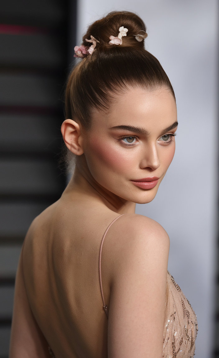 This sleek bun is elegantly styled high on the head, with delicate floral accents that add a touch of charm. The glossy brunette hair is tightly gathered, creating a polished and sophisticated updo. Ideal for medium hair or long hair, this look is perfect for spring events or an office setting, offering a blend of simplicity and refinement.