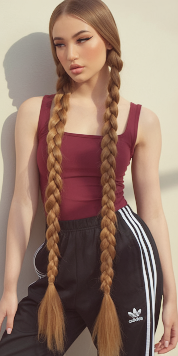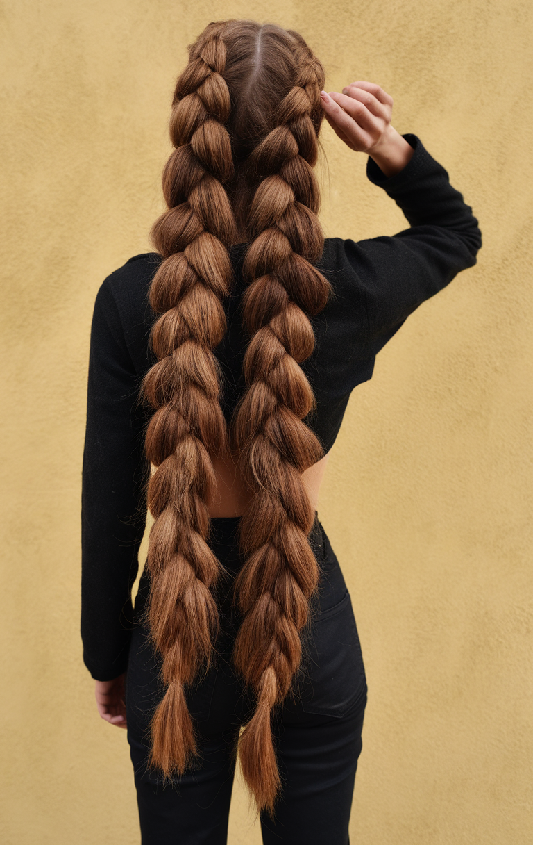 These long double braids are a bold and playful take on a classic look, ideal for spring school or casual settings. The reddish-brown color adds warmth, while the thick, neat braids showcase volume and structure. Perfect for thick hair, this style captures a quick and easy spring hairstyle with a touch of Viking-inspired flair.