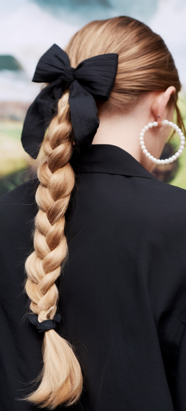 This braided ponytail features a sleek finish with golden blonde hair styled into a thick, classic braid. The addition of a black bow at the base elevates its charm, making it perfect for spring school days or casual outings. Ideal for long hair, this hairstyle works beautifully for both thin hair and thick hair.