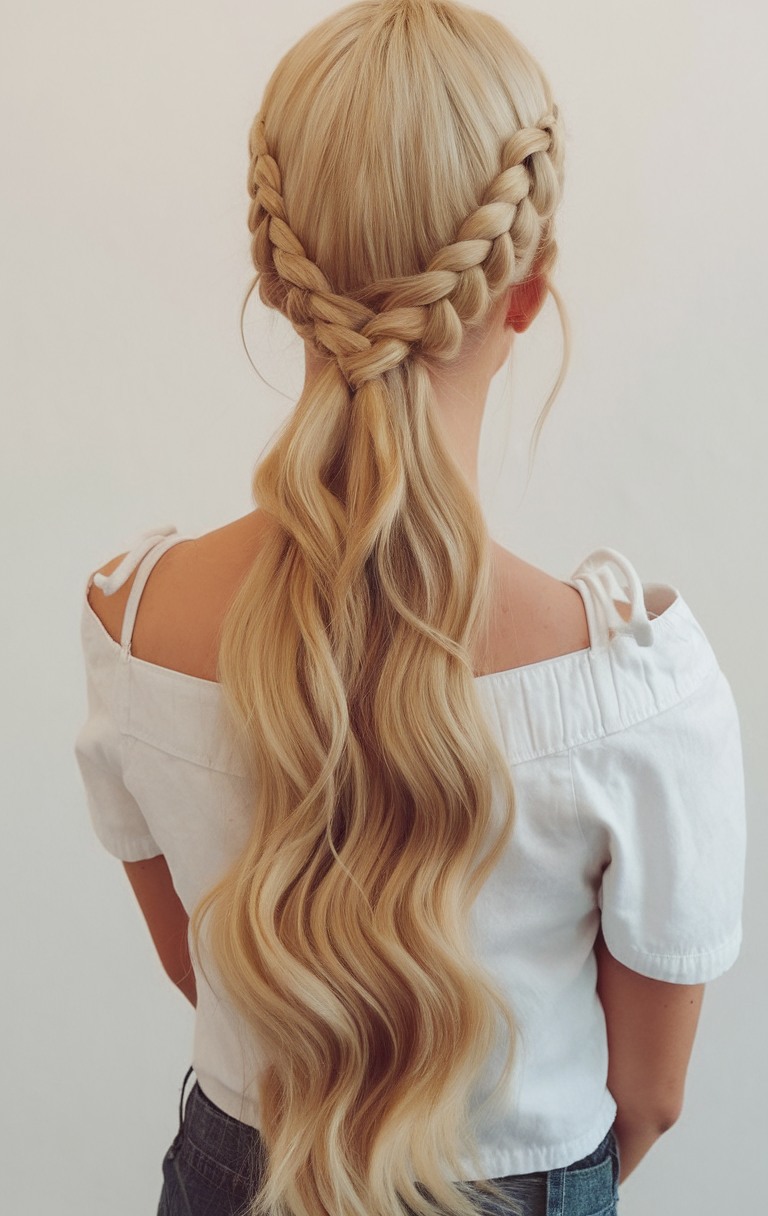 A romantic half-up braided hairstyle, this look combines two symmetrical braids that flow into soft, cascading waves. The golden blonde color enhances the intricate braiding and loose curls, making it ideal for medium hair or long hair. This style is perfect for everyday wear or spring events, offering a touch of elegance with minimal effort.