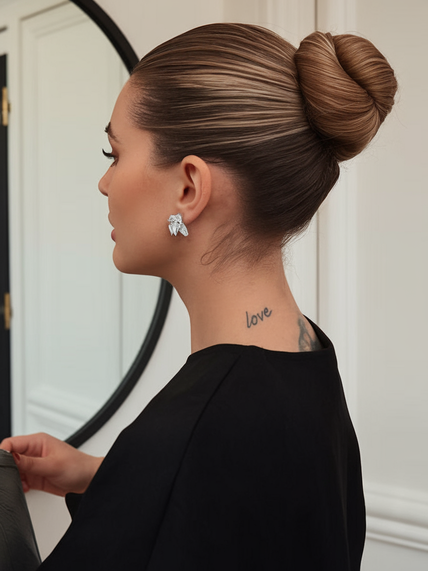 This sleek bun is styled high with a tight, polished finish that exudes sophistication. The rich brunette tone adds depth and shine, making it ideal for thin hair or medium-length hair. Perfect for office settings or formal spring events, this look highlights simplicity and precision.