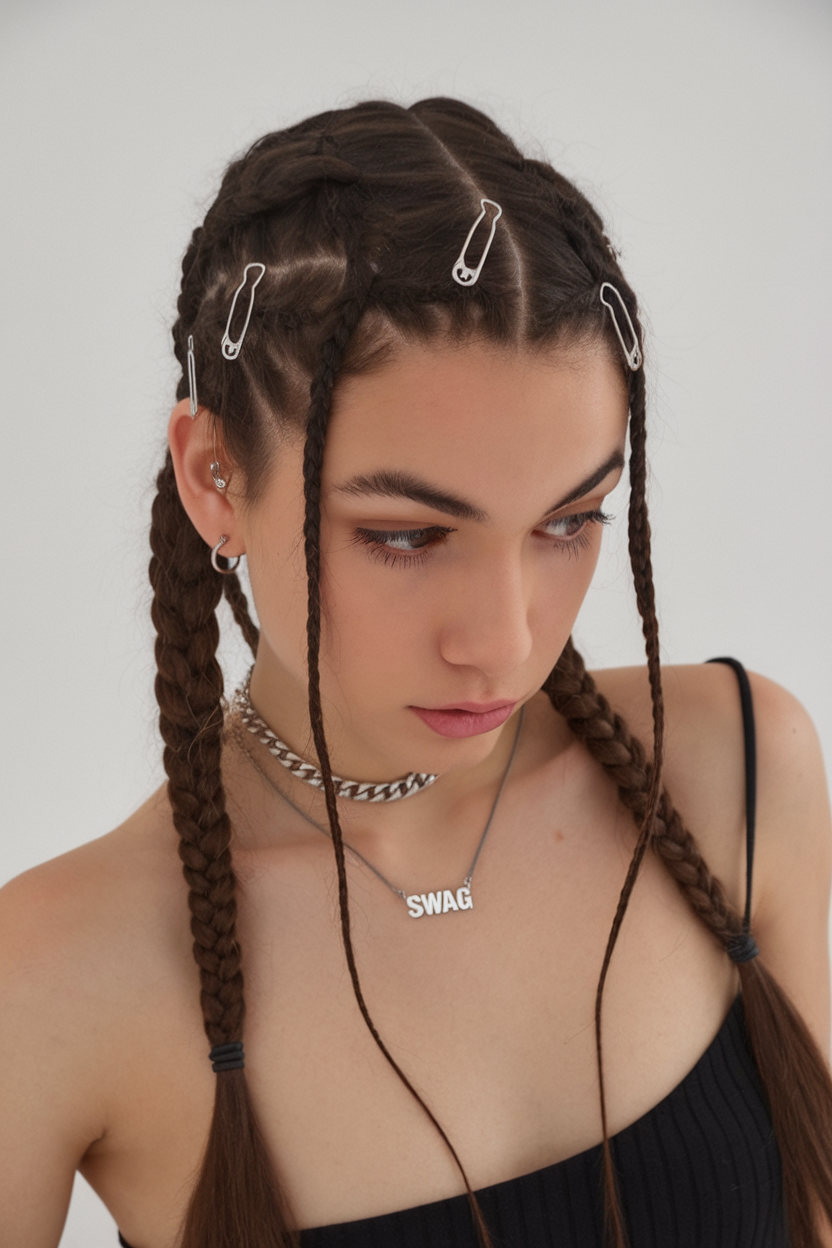 This double braided cornrow style features two neat, symmetrical braids running down either side of the head. The dark brunette hair is accentuated with silver safety pin accents, adding an edgy vibe. Perfect for thin hair, this look works well for school or as a daily spring hairstyle, offering a bold yet manageable option.