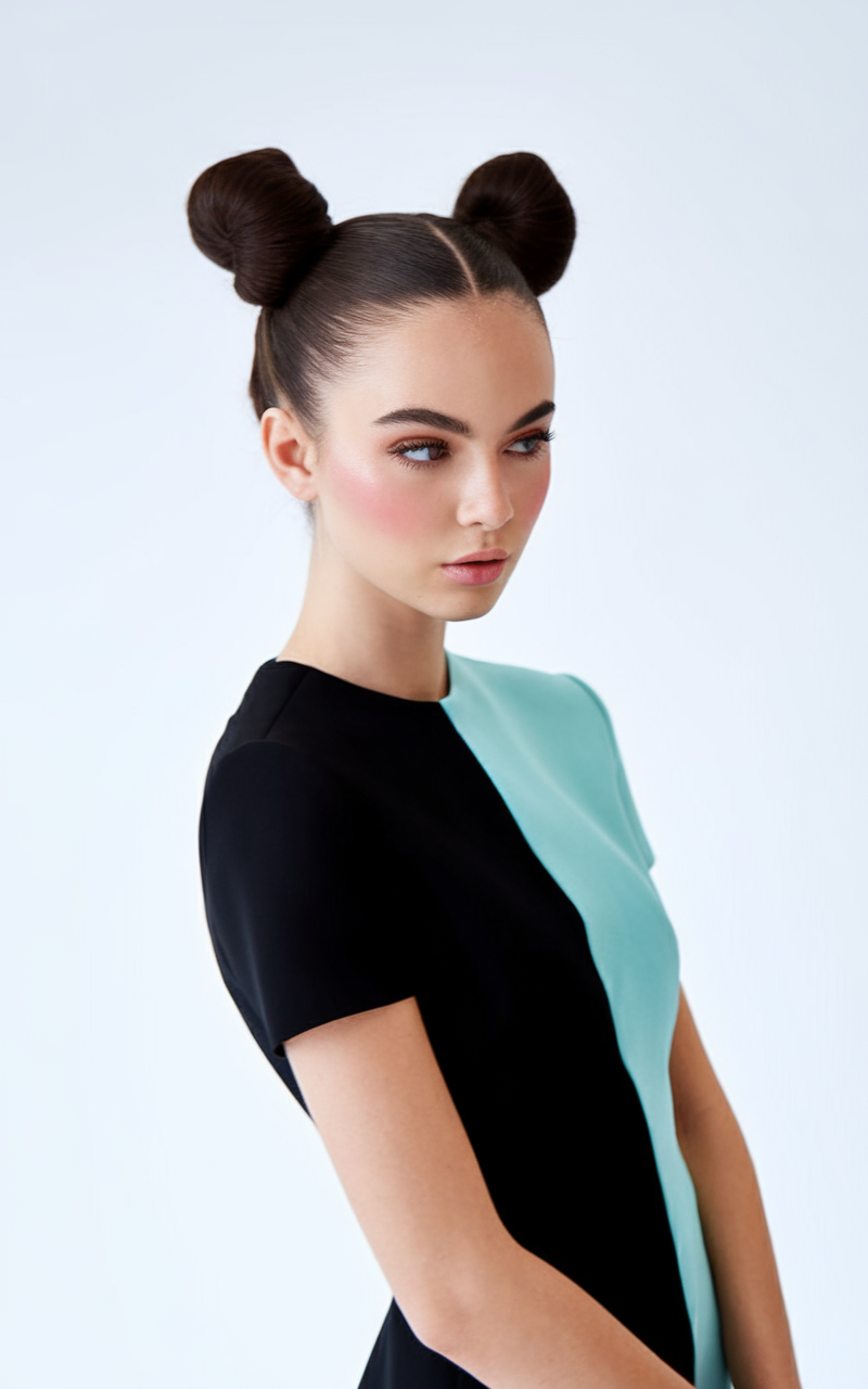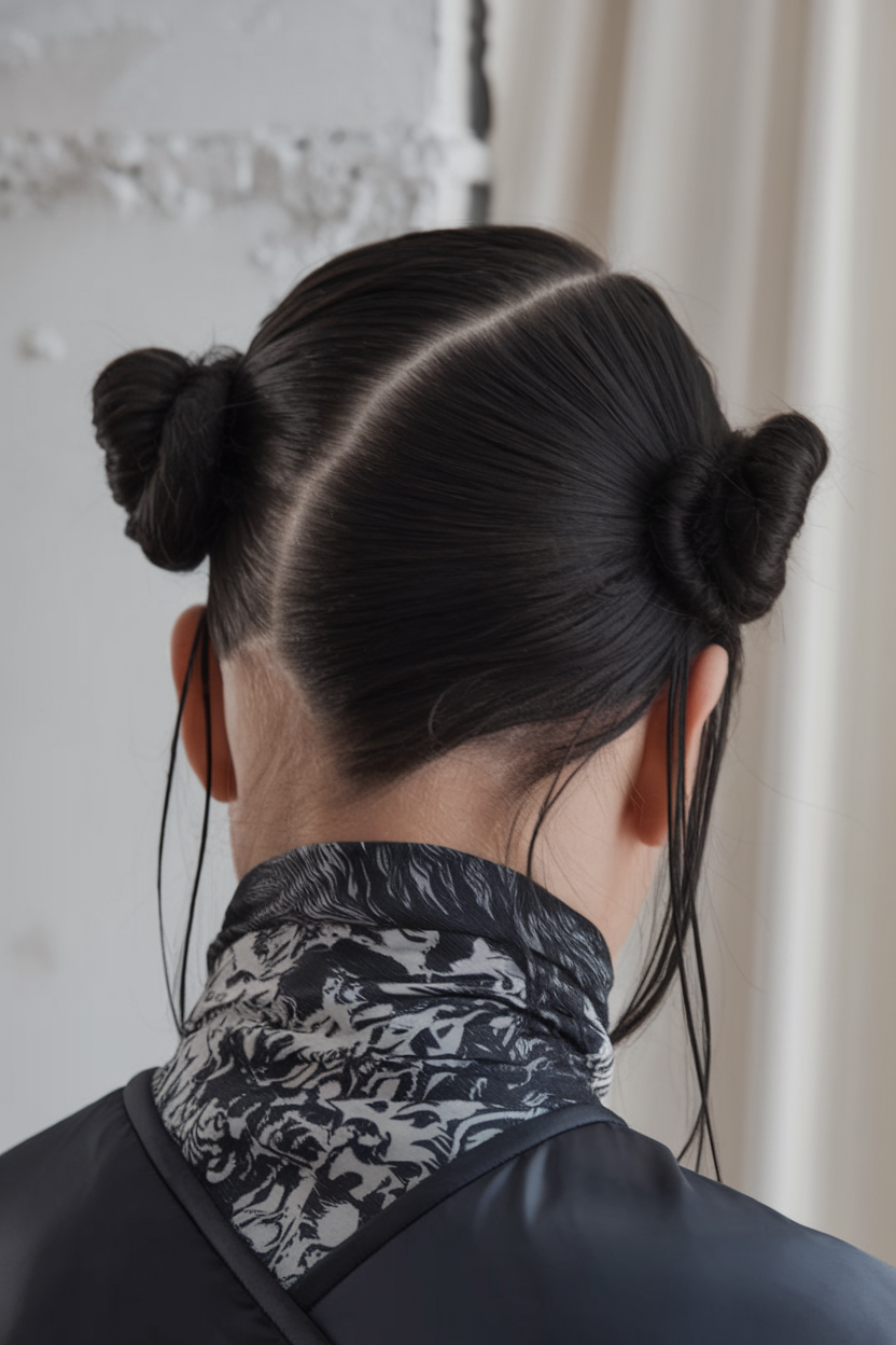 Sleek and edgy, this double bun hairstyle is crafted with precise parting and smooth, polished hair. The glossy black color emphasizes the modern look, while the twisted buns at the nape of the neck add a playful yet sophisticated detail.