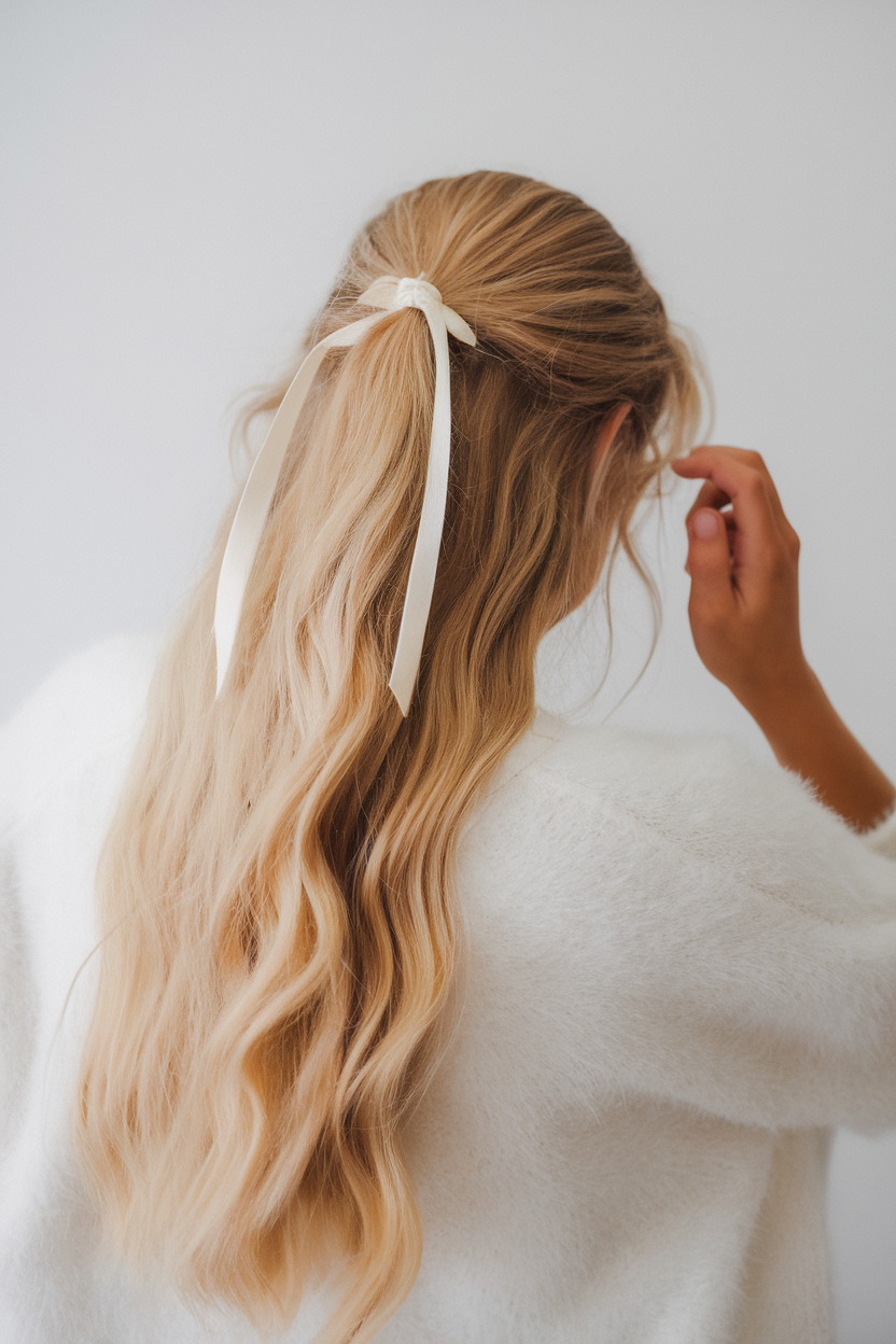A soft half-up hairstyle is elevated with a delicate white ribbon tied at the crown. The honey-blonde waves flow effortlessly, creating a feminine and romantic vibe perfect for spring events. This style works beautifully with medium-length hair or long hair and pairs seamlessly with both casual and formal looks.