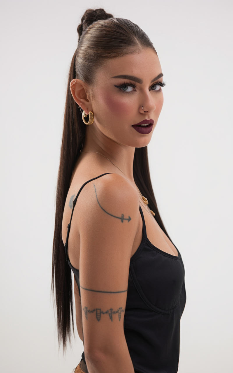This edgy half-up top knot features a sleek and polished base with a high knot, paired with straight and glossy dark brunette lengths. The look is modern and bold, perfect for concerts or a night out. Best suited for thick hair, it offers a blend of elegance and attitude.